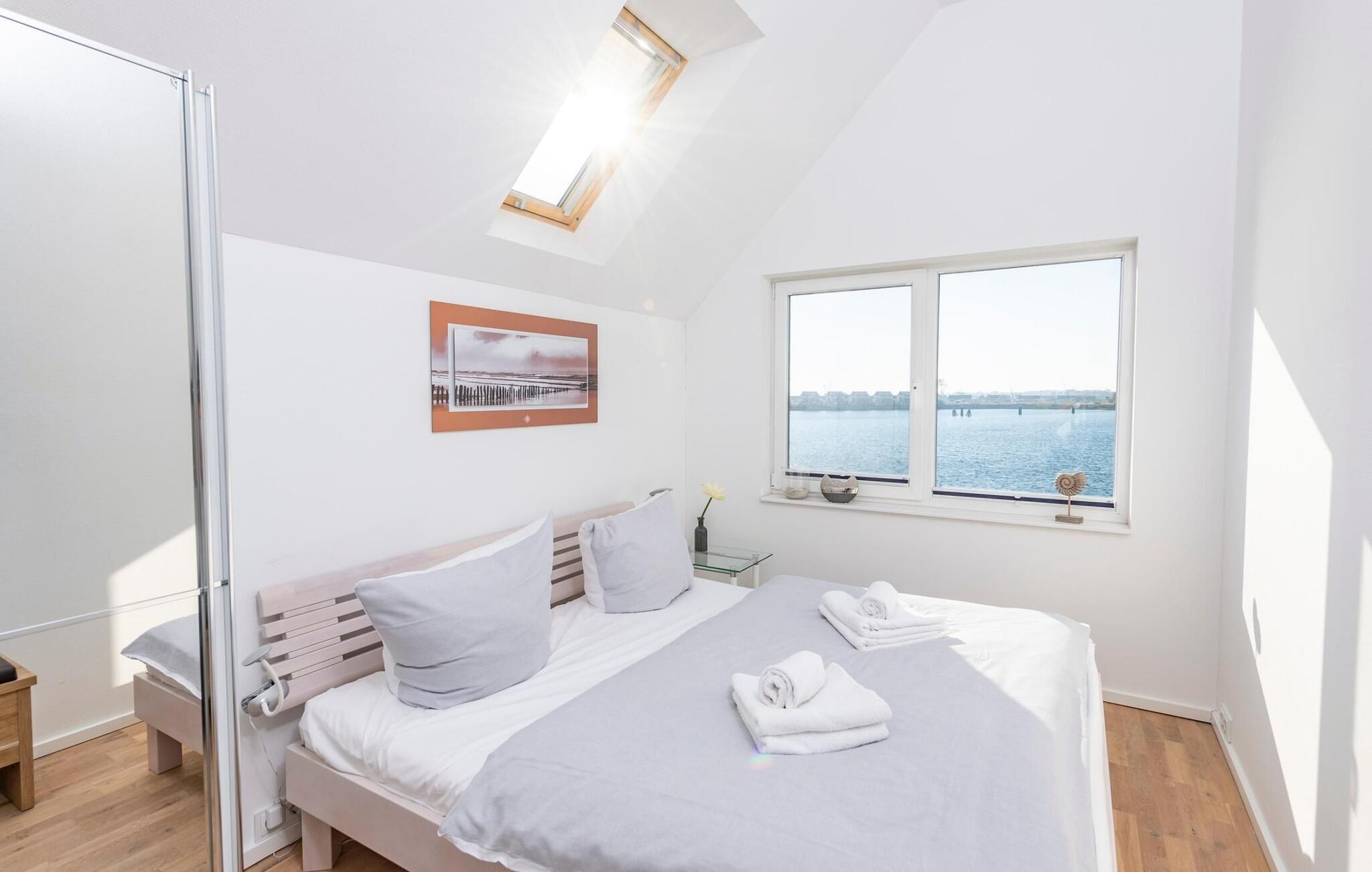 Zwei Schlafzimmer in der oberen Wohnebene bieten bis zu vier Erwachsenen Platz zum Schlafen und Träumen bei Wasserblick.