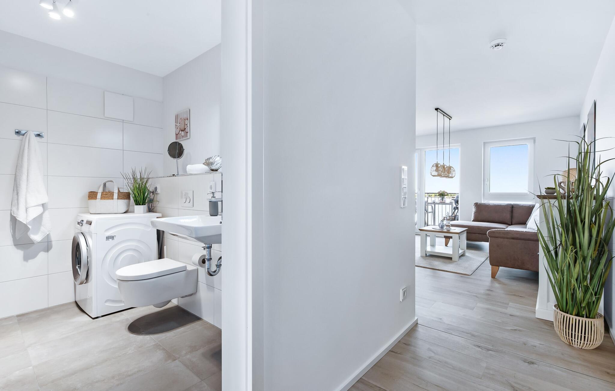 Die exklusive Einrichtung und Ausstattung der Wohnung, wie beispielsweise die gelungene räumliche Verbindung der modernen Küchenzeile zu dem exklusiven Wohnbereich, hebt die behagliche Atmosphäre der ruhigen Umgebung hervor. Es lassen sich vom kompletten Wohn- und Essbereich und dem Balkon aus, vorbeifahrende Boote bei der Ostseeeinfahrt beobachten. Ein HAFENMEERBLICK der seinesgleichen sucht.