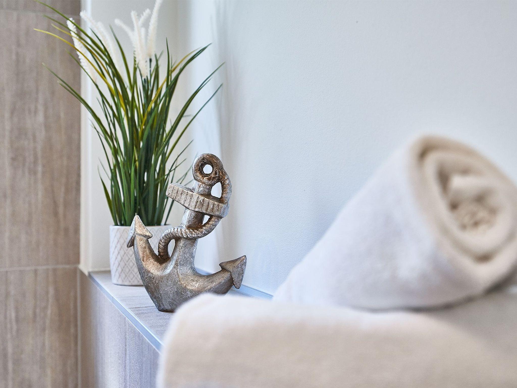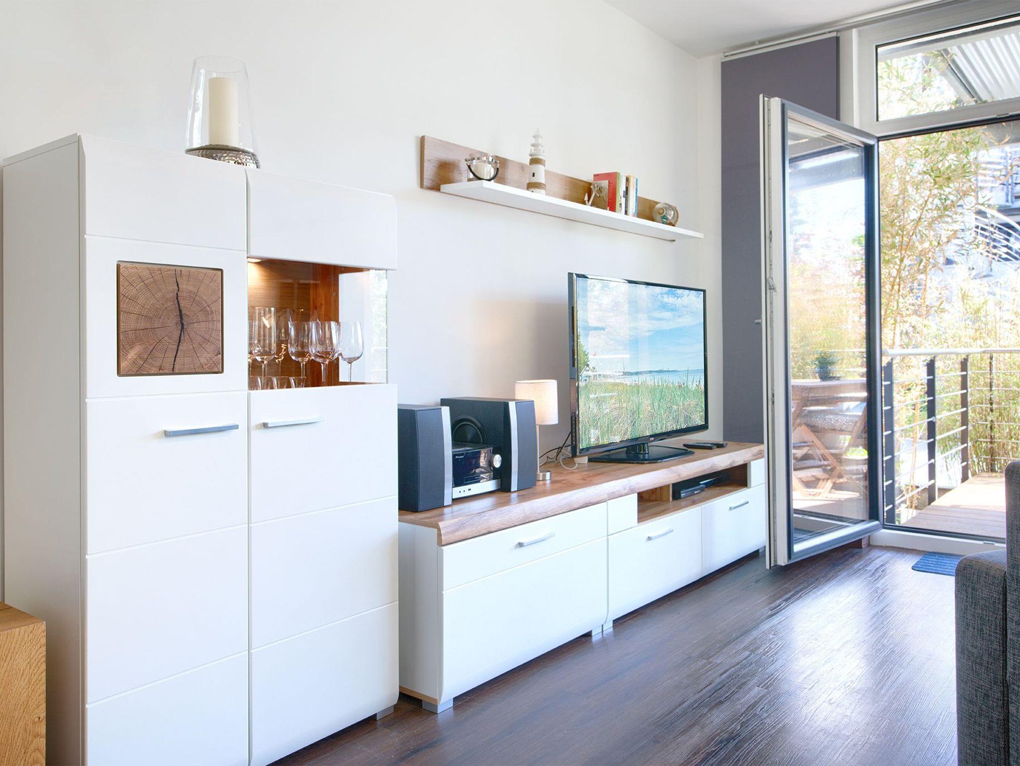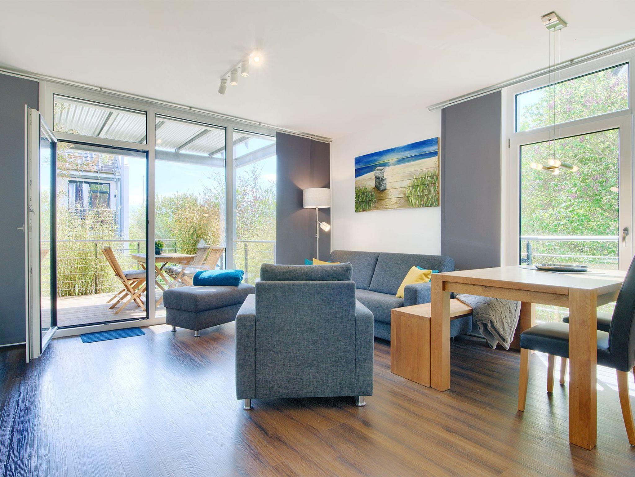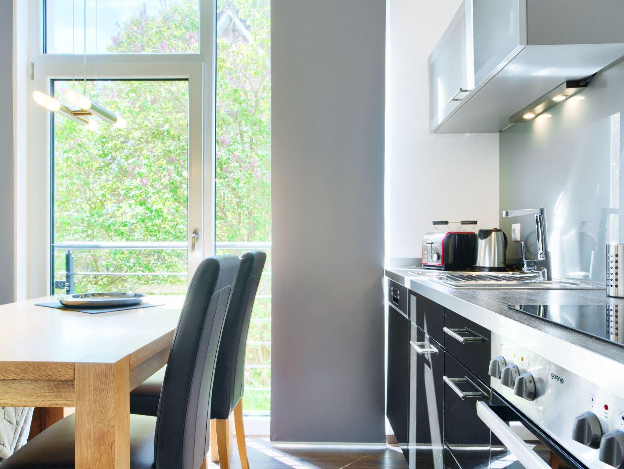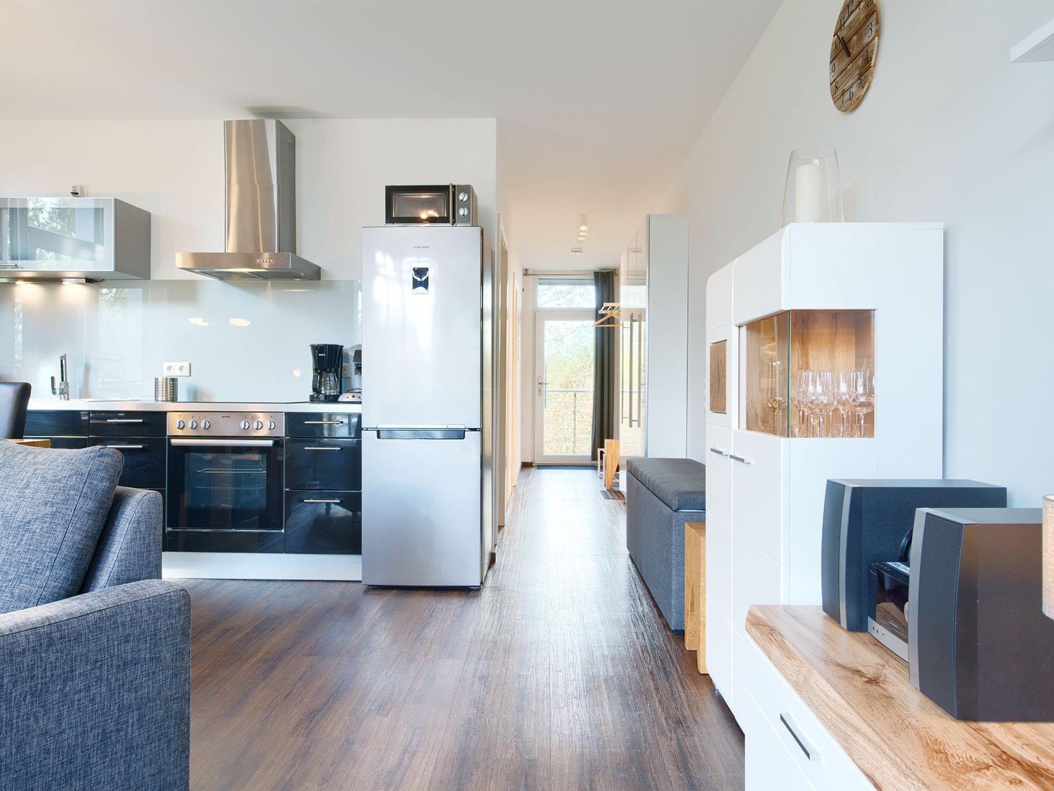 Diese moderne Ferienwohnung ist geschmackvoll und harmonisch eingerichtet. Der Wohnbereich ist mit einem Sofa ausgestattet, welches in wenigen Handgriffen zu einem bequemen Schlafsofa (1,60 x2,00m, mit Lattenrost ) umfunktioniert werden kann. Der Essbereich lädt zum gemütlichen Essen oder auch zu einem spannenden Spieleabend ein. Technisch bietet Ihnen das Wohnzimmer einen Smart-TV, eine Stereoanlage, kostenloses WLAN ist selbstverständlich. Die offene Küche ist komplett eingerichtet und besticht zusätzlich mit einer Kaffeemaschine, einer Senseo, einer Spülmaschine, einer Mikrowelle und einer Kühl-Gefrier-Kombi. Das Schlafzimmer ist mit einem Boxspringbett (1,80 x 2,00m), mit einer durchgehenden Matratze, und einem Smart-TV sowie mit einem Kleiderschrank ausgestattet. Das tageslichtdurchflutete Badezimmer verfügt über eine Eckbadewanne mit Regendusche, einen Föhn, einen Kosmetikspiegel und einen Handtuchheizkörper.