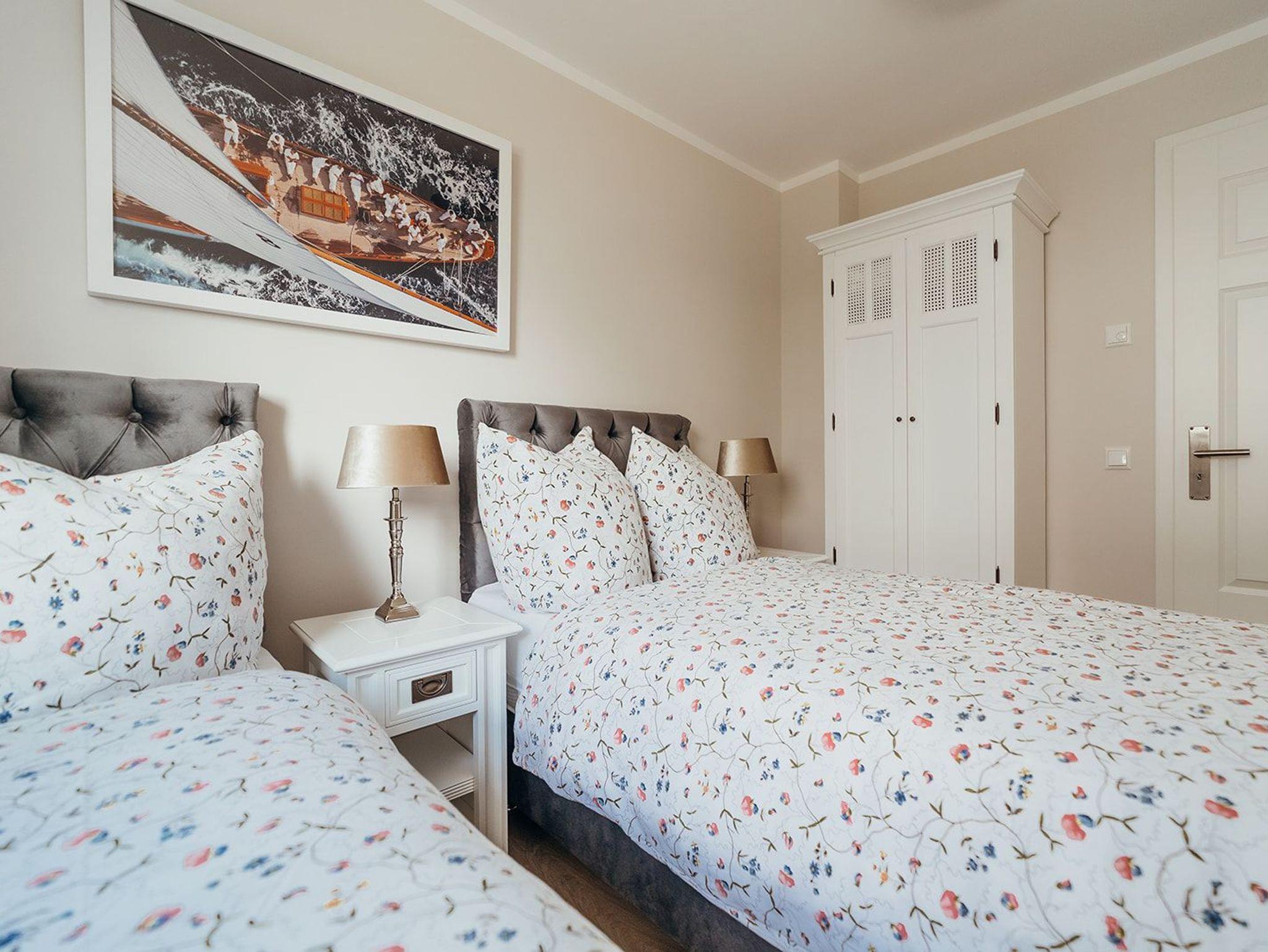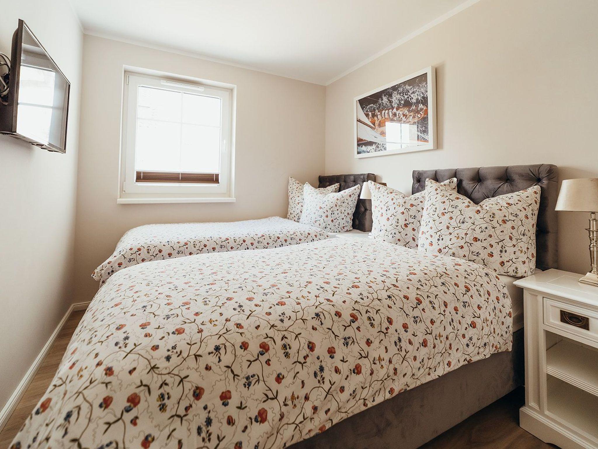 Diese Wohnung bietet einen direkten, unverbauter Blick durch bodentiefe Fenster auf den Strand von Haffkrug. Die Wohnung ist ca. 60m² groß. Zwei separate Schlafzimmer mit Boxspringbetten, ein Wohn-Essbereich mit integrierter Küchenzeile, zwei Duschbäder mit WC und eine schöne Terrasse mit Balkonmöbeln umschreiben dieses wunderschöne Feriendomizil in unserem Neubau.