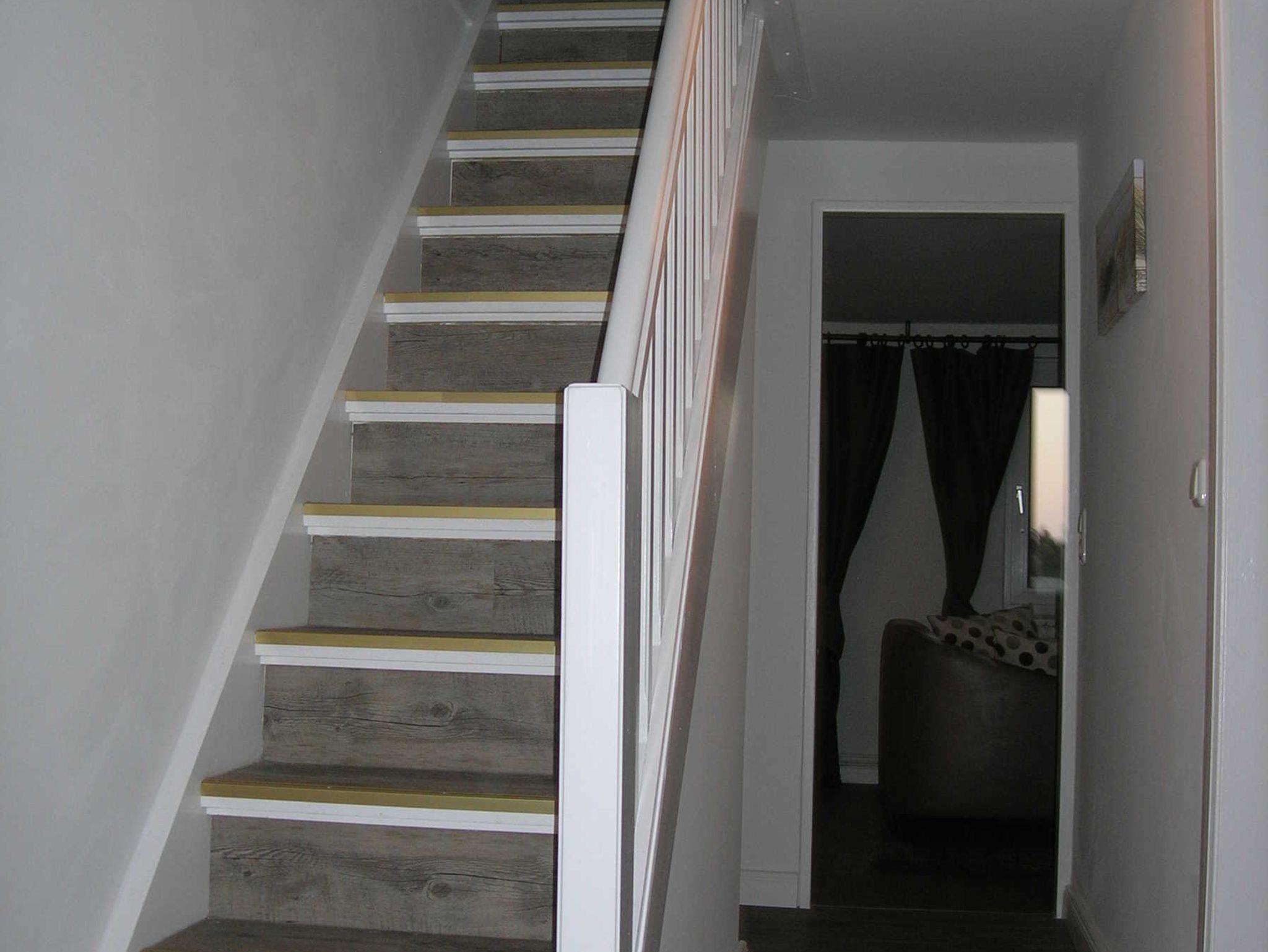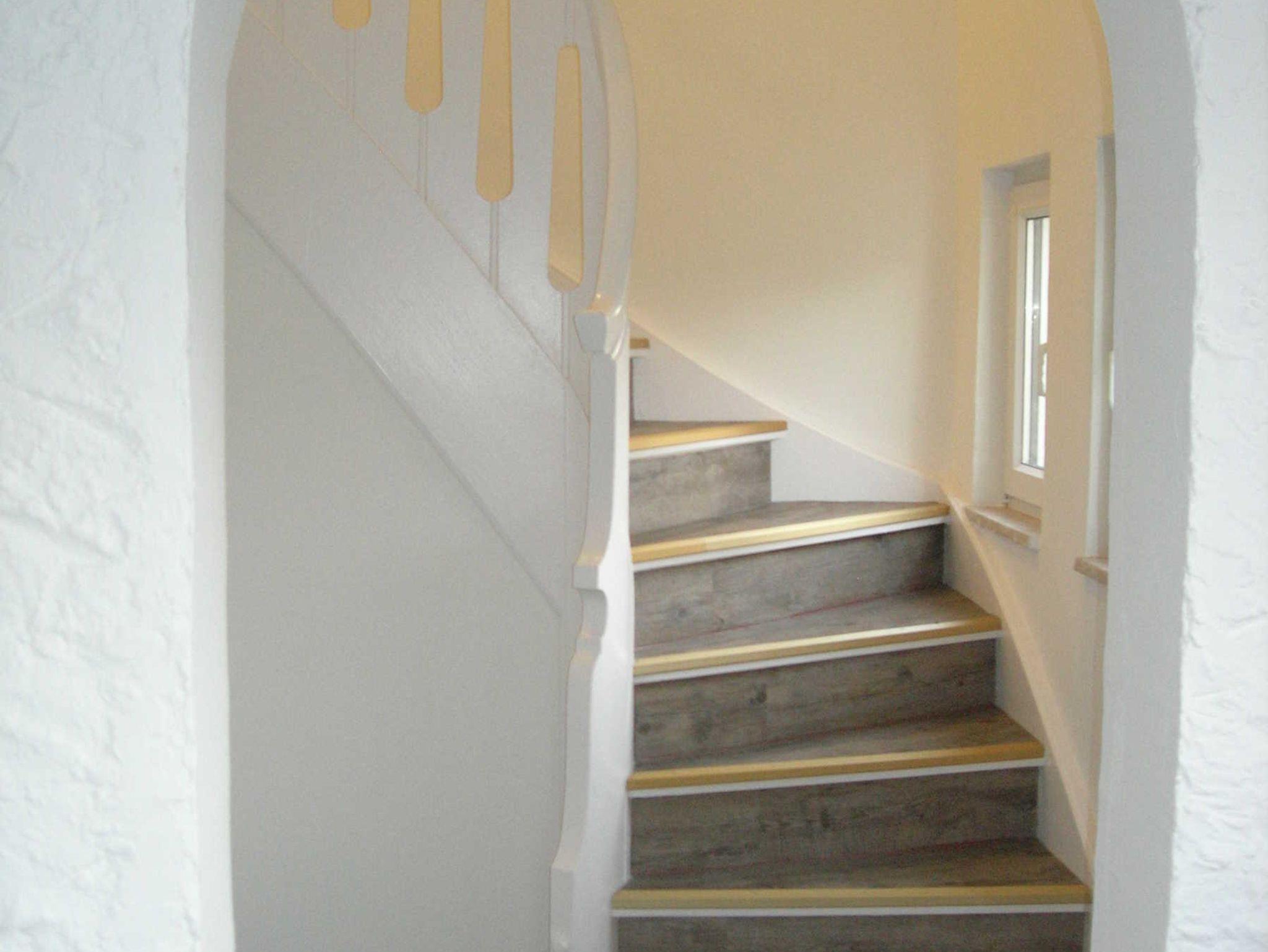 Ruhige Maisonettwohnung im 1. Obergeschoss. Im Flur führt die Treppe hoch zur ersten Wohnebene. Zwei Schlafzimmer befinden sich im Dachgeschoss. Ein Schlafzimmer mit Doppelbett ist ein Durchgangszimmer zu dem Schlafzimmer mit den 2 Einzelbetten.