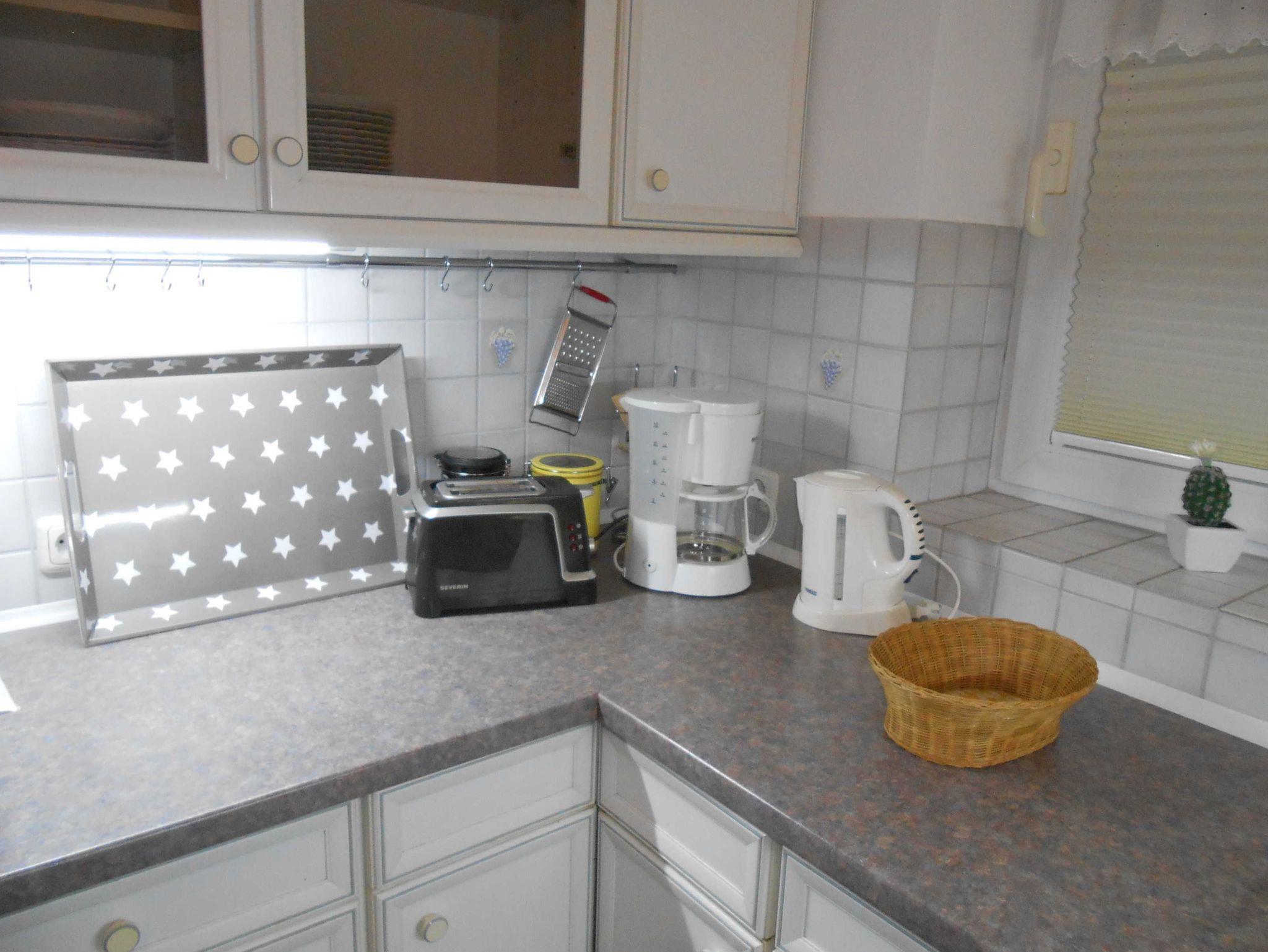 Die Ferienwohnung hat ein Bad mit Badewanne sowie eine Gästetoilette. Die Küche (mit Spülmaschine) und Flur besitzen Bodenfliesen, im Rest der Wohnung ist Laminat verlegt worden. Zwei Schlafzimmer haben französische Betten (140 x 200 cm), ein weiteres Schlafzimmer hat ein Bett (180 x 200 cm). Im Anbau im Wohnzimmer steht zusätzlich noch eine Schlafcouch für zwei Personen. Direkt vom Anbau gelangt man in den 20 m² großen Wintergarten, der einen direkten Zugang in den Garten hat. Dort gibt es einen Platz im Carport für ein Fahrzeug. Der Kamin steht leider nicht zur Benutzung zur Verfügung. Im Garten kann man die Seele baumeln lassen. Ein Kinderreisebett (ohne Bettwäsche!!!!) und ein Kinderstuhl werden gerne kostenlos zur Verfügung gestellt.