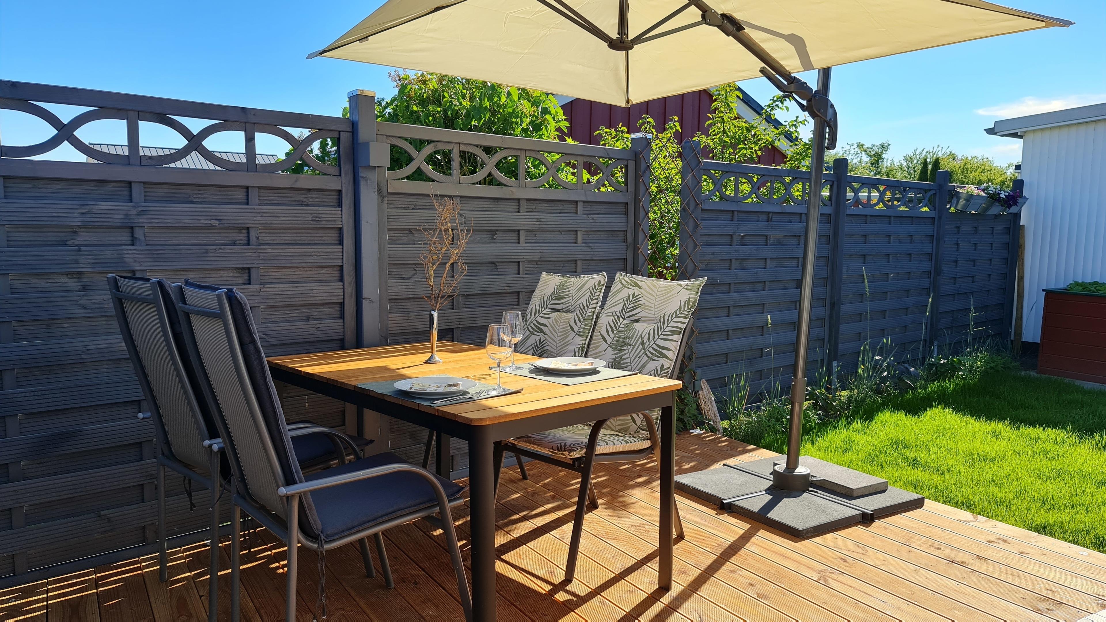 Ihr Domizil hält im Außenbereich eine TERRASSE mit Stühlen, Tisch, Sonnenschirm und Grillmöglichkeit bereit. Auf der kleinen Grünfläche genießen Sie die Sonne und lauschen den Wellen in nur 80 Meter Entfernung.