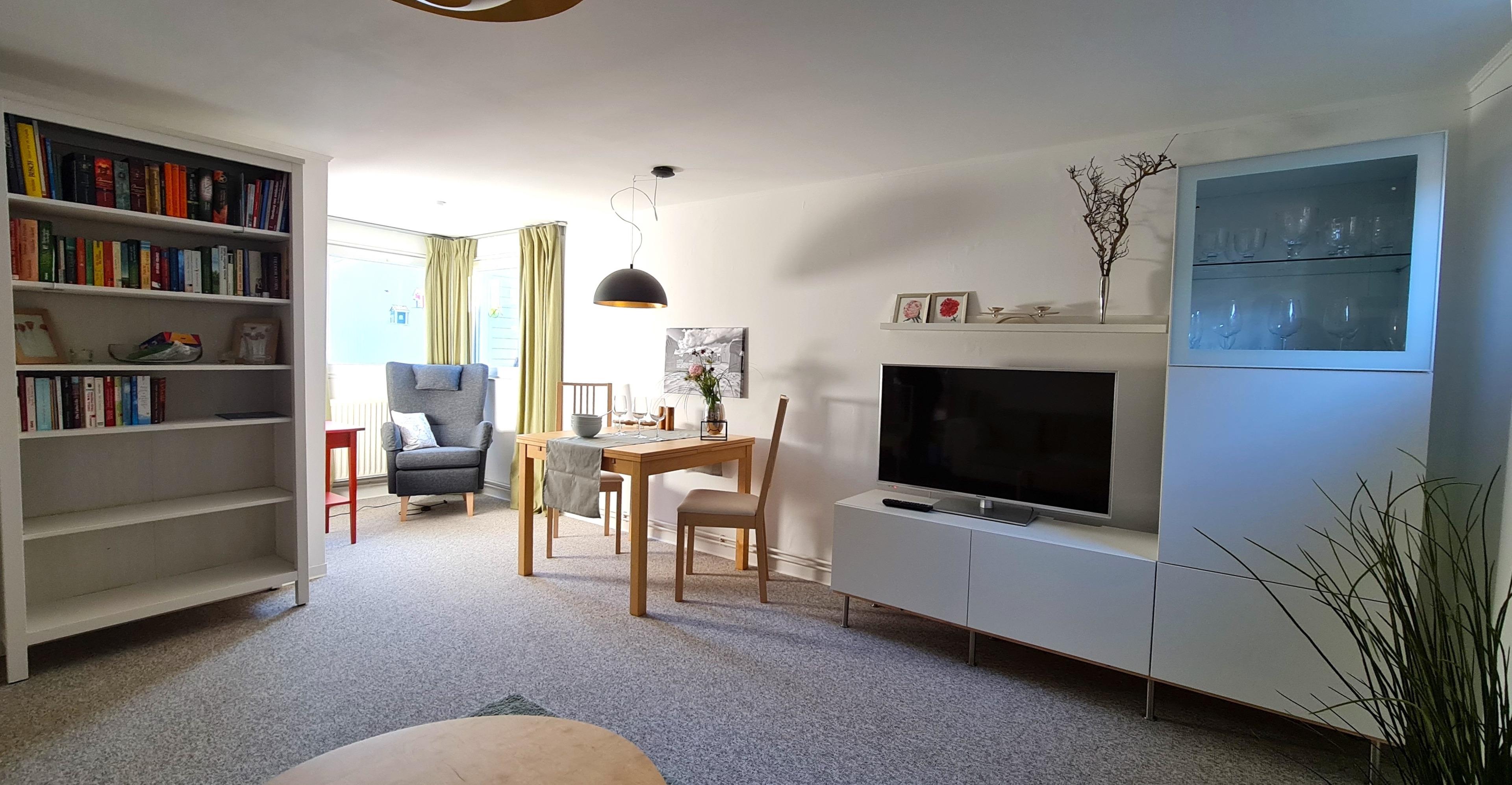 Großzügig mit Ecksofa, Flachbild-TV, Bluetooth Lautsprecher, kostenlosem WLAN, Vitrine und Esstisch. Am Abend entspannen Sie bei einem Buch im Lesesessel.