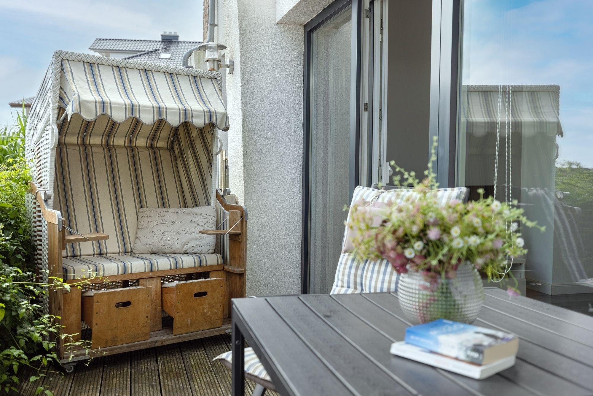 Nur noch einige Treppenstufen hinauf bis zur Eingangstür. Tür öffnen - die Koffer abstellen und den schönen Meerblick auf Ihrem Balkon im Strandkorb genießen.