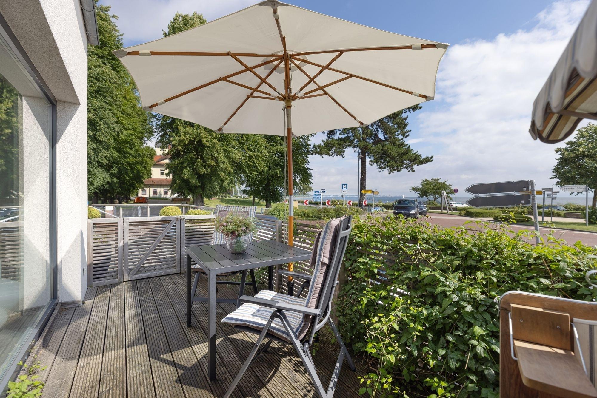 Charmante Ferienwohnung in Haffkrug mit Balkon, Meerblick und Sauna für entspannte Ostseeferien.