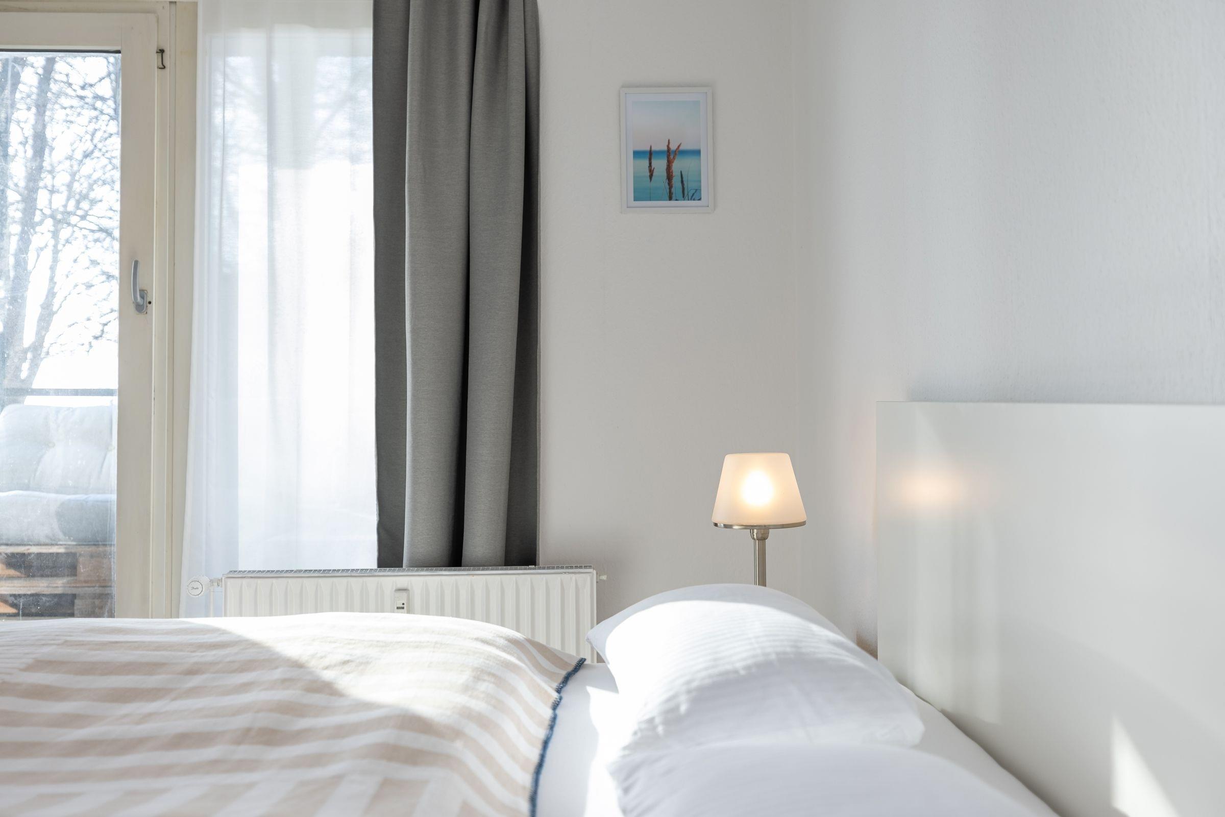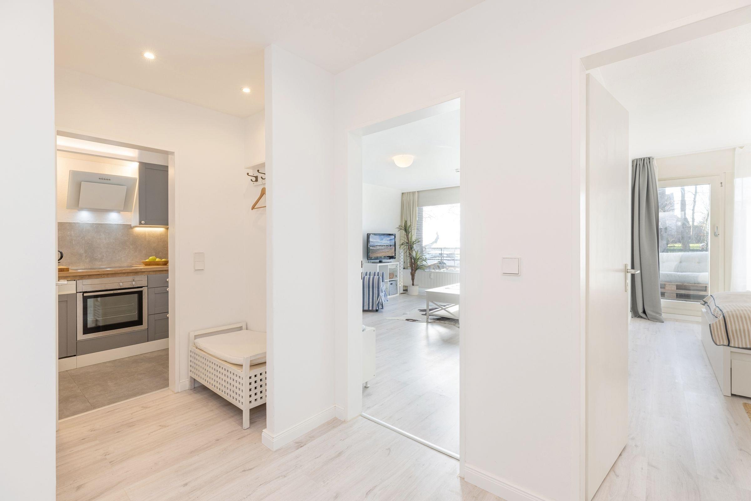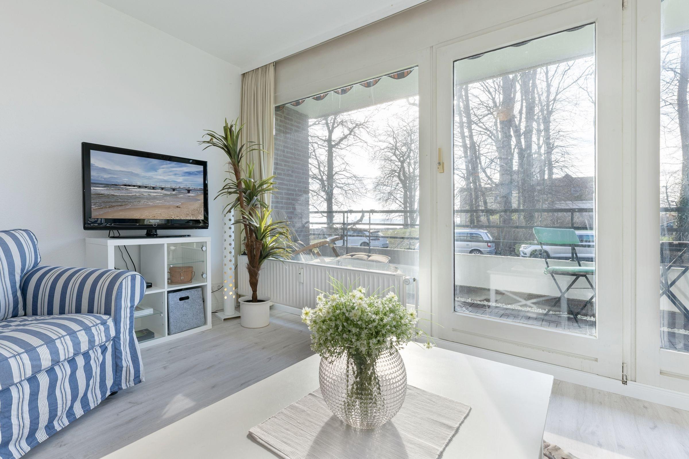 Vom Flur aus gelangen Sie in den maritimen Wohnbereich mit gemütlicher Schlafcouch (160x200 cm), TV und einem Essplatz, an dem Sie gemeinsam Ihre Mahlzeiten einnehmen können. Die angrenzende Küche ist mit allen Annehmlichkeiten ausgestattet. Über den Tresen zwischen Küche und Wohnzimmer kann alles bequem zum Esstisch gereicht oder zusätzlich abgestellt werden. Geruhsame Nächte verspricht das helle Schlafzimmer mit Doppelbett (2 x90x200cm). Vom Wohnbereich sowie vom Schlafzimmer aus gelangen Sie auf den Balkon und können den seitlichen Blick auf die schöne Ostsee genießen.
