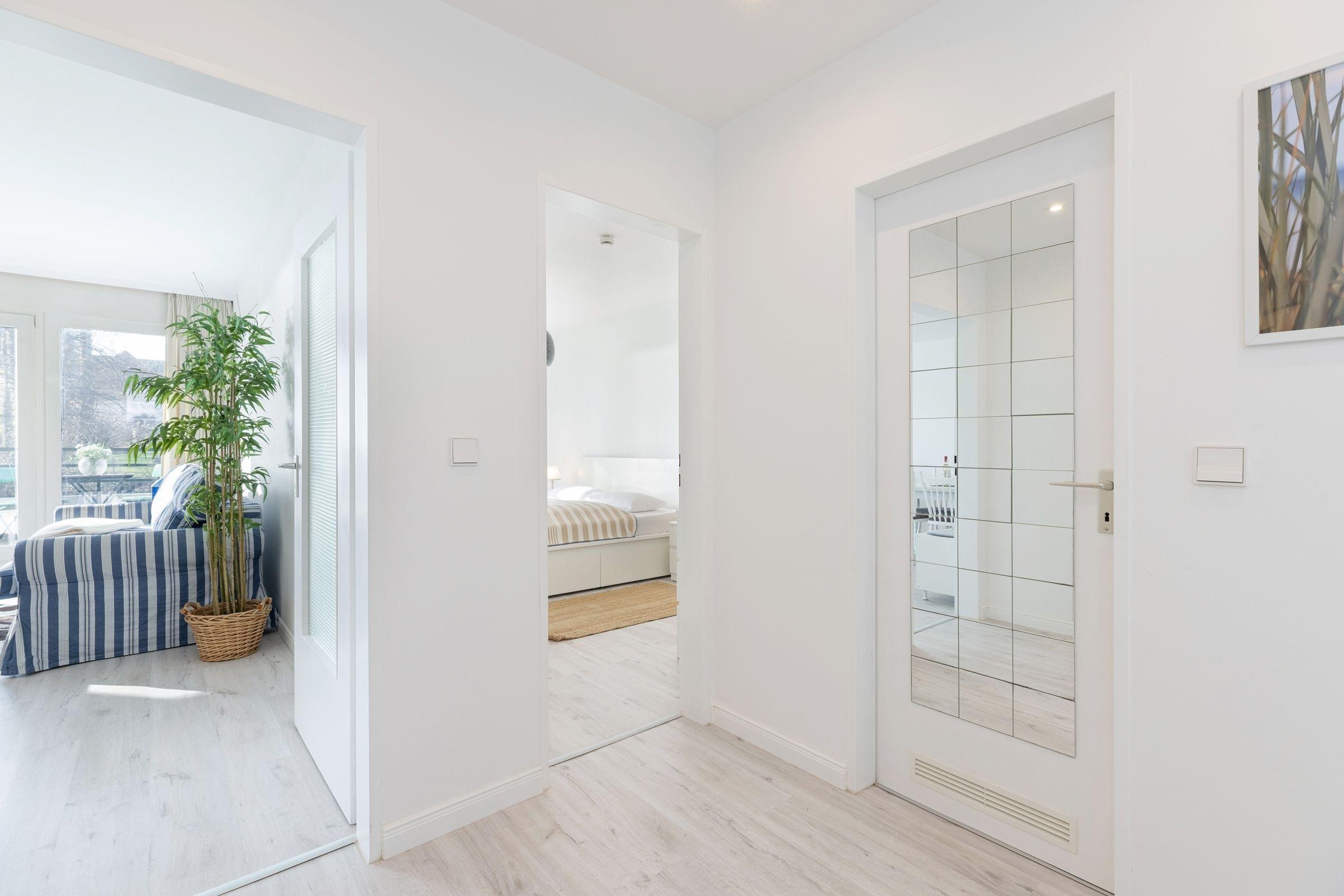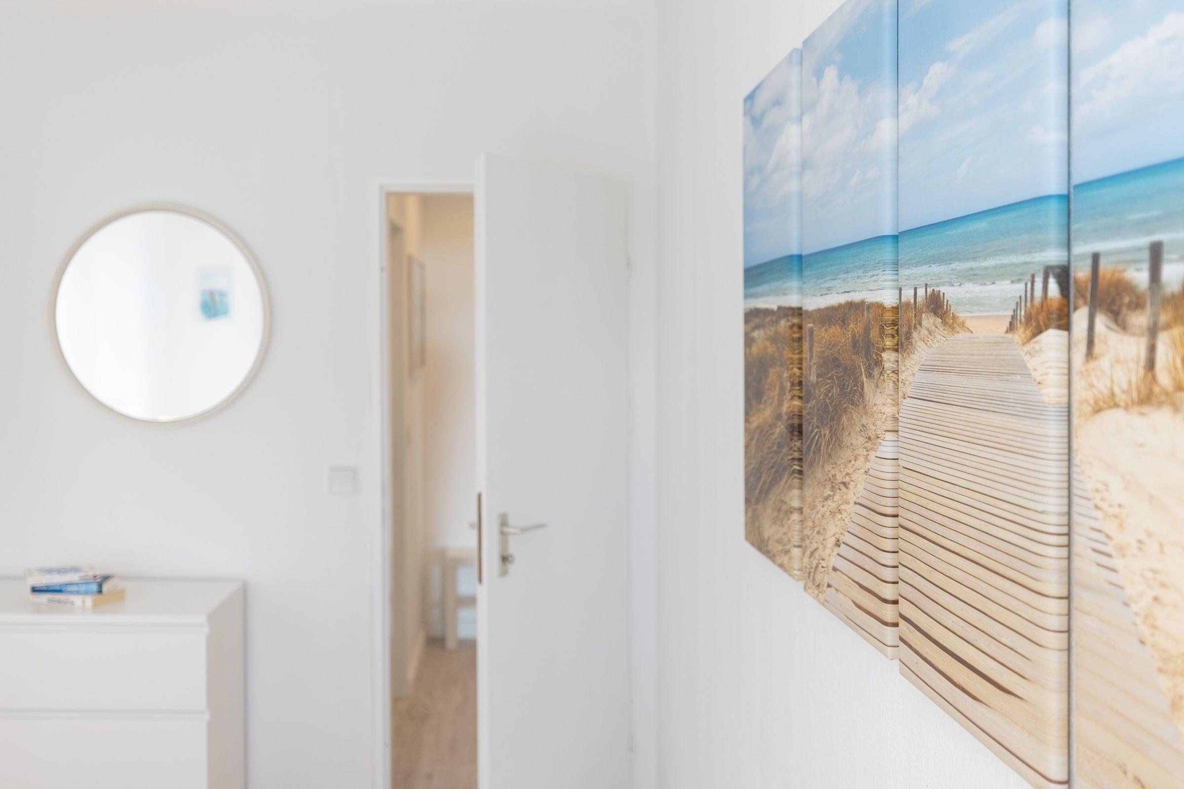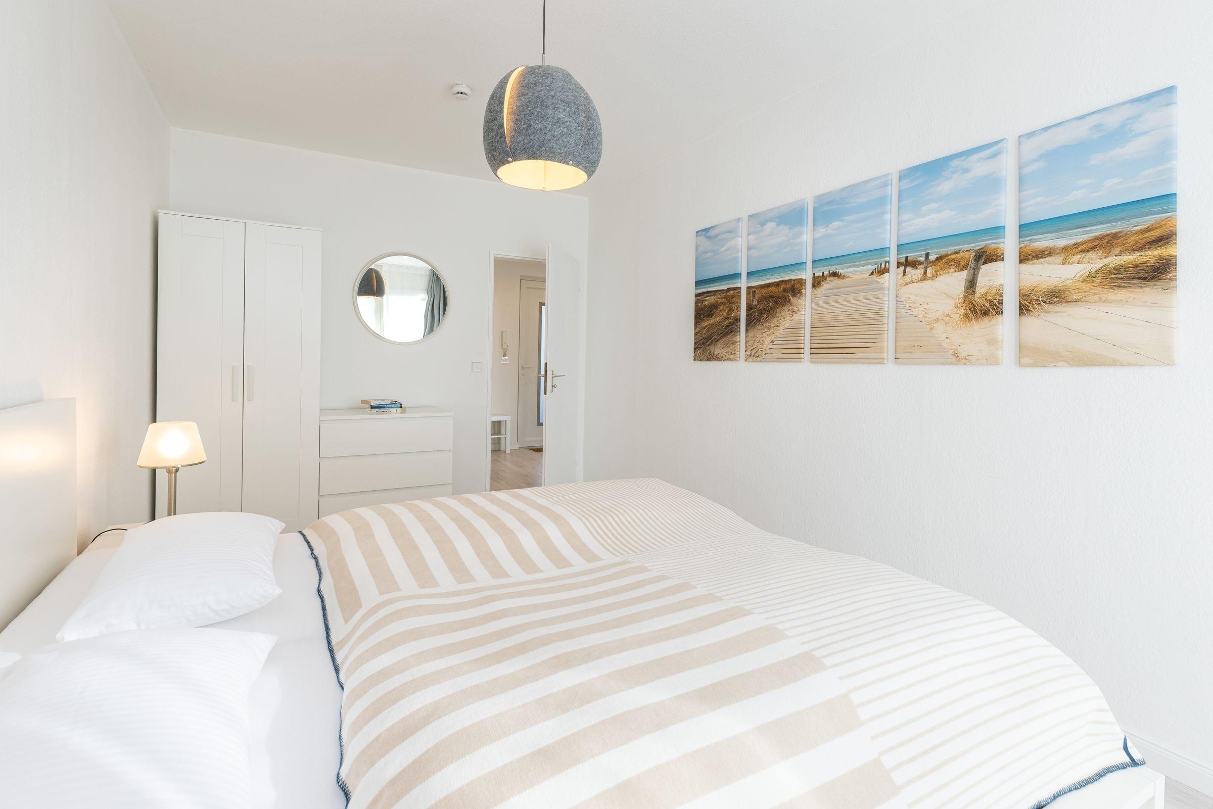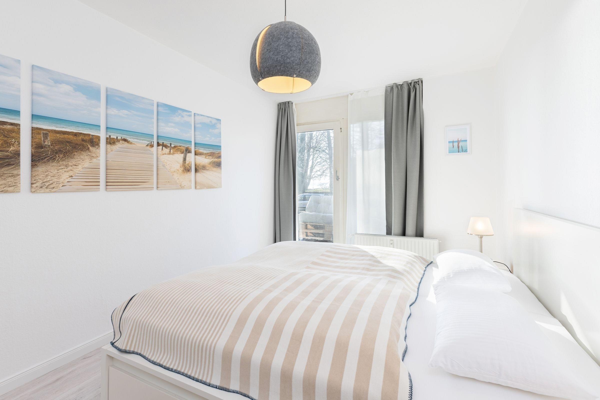 Vom Flur aus gelangen Sie in den maritimen Wohnbereich mit gemütlicher Schlafcouch (160x200 cm), TV und einem Essplatz, an dem Sie gemeinsam Ihre Mahlzeiten einnehmen können. Die angrenzende Küche ist mit allen Annehmlichkeiten ausgestattet. Über den Tresen zwischen Küche und Wohnzimmer kann alles bequem zum Esstisch gereicht oder zusätzlich abgestellt werden. Geruhsame Nächte verspricht das helle Schlafzimmer mit Doppelbett (2 x90x200cm). Vom Wohnbereich sowie vom Schlafzimmer aus gelangen Sie auf den Balkon und können den seitlichen Blick auf die schöne Ostsee genießen.