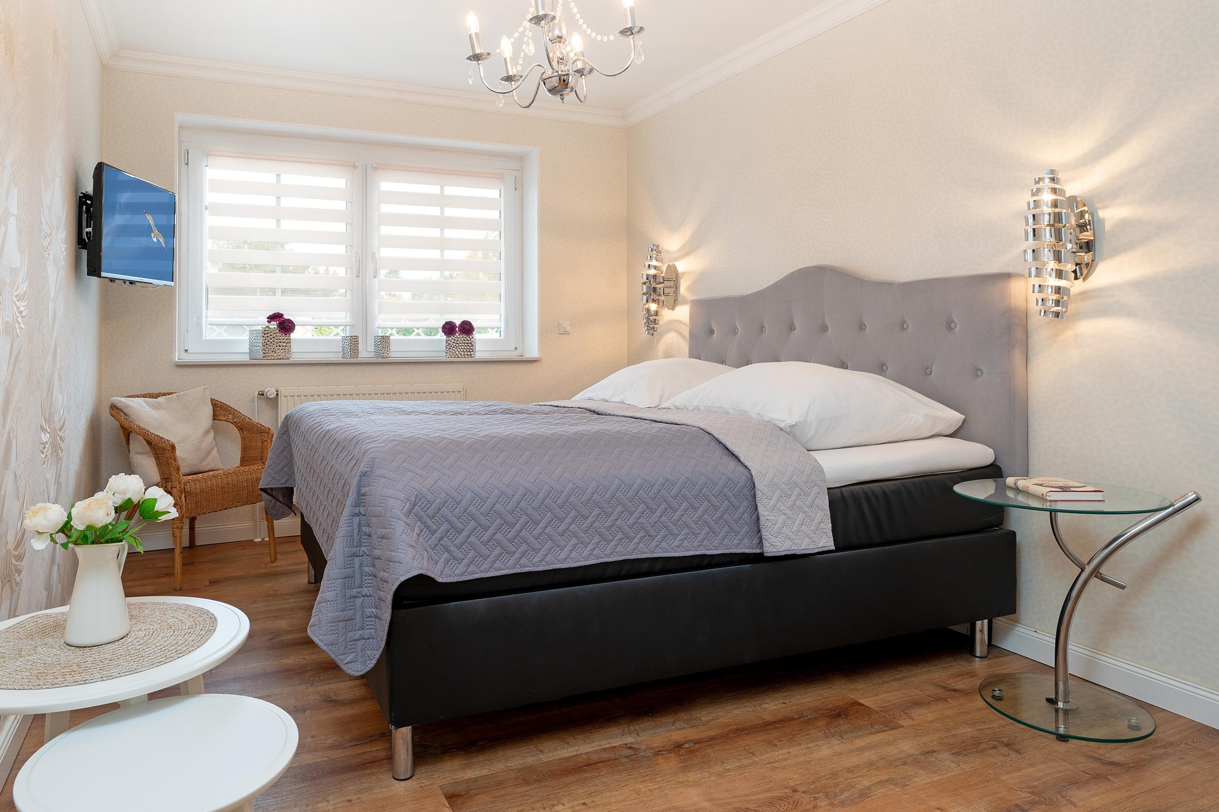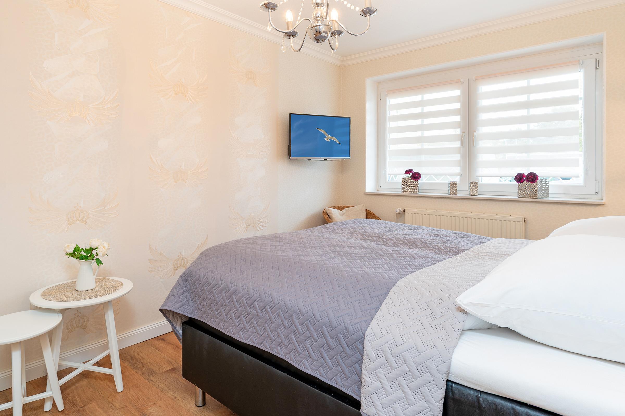 Schlafzimmer: 1 Boxspringbett (durchgehender Topper, 180 x 200 cm), Kleiderschrank, TV, Verdunkelung: elektrische Rollläden, kein Platz für ein Babybett vorhanden