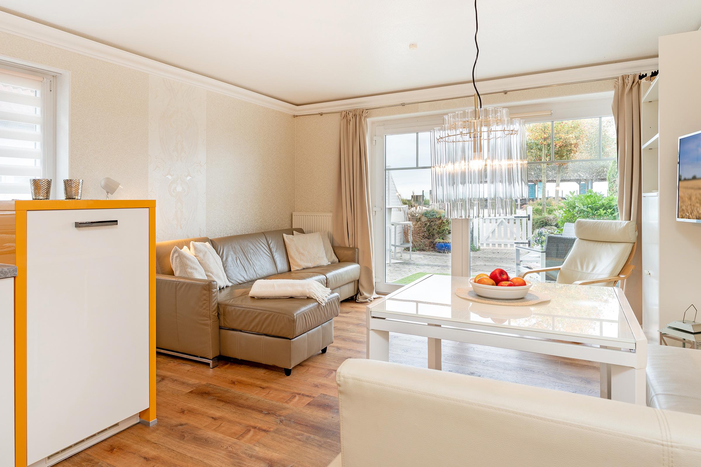 Die moderne Ferienwohnung Himmel & Meer im Erdgeschoss des Appartementhauses Strand Domizil überzeugt mit ihrer durchdachten Ausstattung und der direkten Nähe zum Strand. Hier trennen Sie nur wenige Meter vom feinen Sandstrand. Der helle Wohnbereich lädt mit einem gemütlichen Schlafsofa, Fernseher und CD-Player zum Entspannen ein. Vom Wohnraum aus gelangen Sie auf die möblierte Terrasse – hier können Sie das maritime Flair, den Blick auf das Meer und das Promenadentreiben in vollen Zügen genießen. Die offene Küchenzeile ist mit Cerankochfeld, Backofen, Kaffeemaschine, Wasserkocher, Toaster, Kühlschrank mit Gefrierfach und einer praktischen Geschirrspülmaschine vollumfänglich ausgestattet. Ein Essplatz bietet ausreichend Raum für gemeinsame Mahlzeiten. Das separate Schlafzimmer verfügt über ein komfortables Boxspringbett (durchgehender Topper). Im modernen, taghellen Duschbad inklusive beheiztem Handtuchhalter, Fußbodenheizung und Föhn fällt das Fertigmachen für den neuen Urlaubstag leicht.