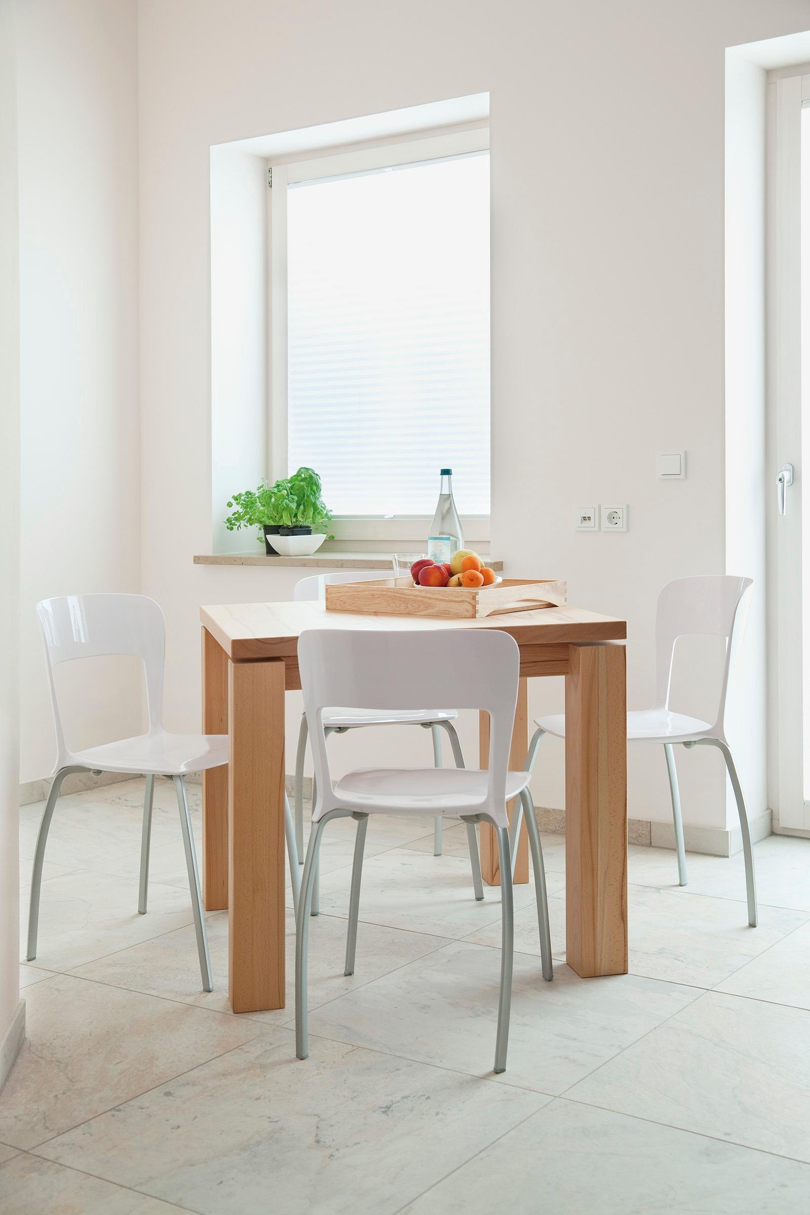 Die sich anschließende Wohnküche mit Essplatz ist voll funktionsfähig ausgestattet für 4 Personen. Von hier aus haben Sie einen Ausgang in den hinter dem Haus liegenden ruhigen Innenhof. Der eingeschlossene Schlafraum verfügt über zwei ökologisch gearbeitete, metallfreie Vollholz-Einzelbetten à 1 x 2 m, die über Eck mit gemeinsamer Ablage am Kopfende beieinander stehen.