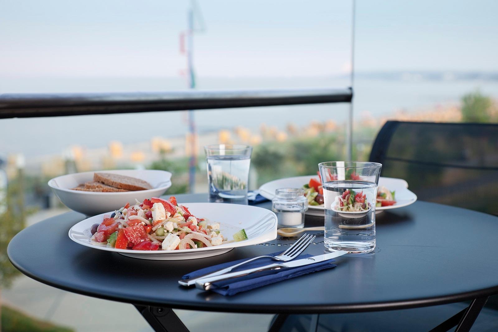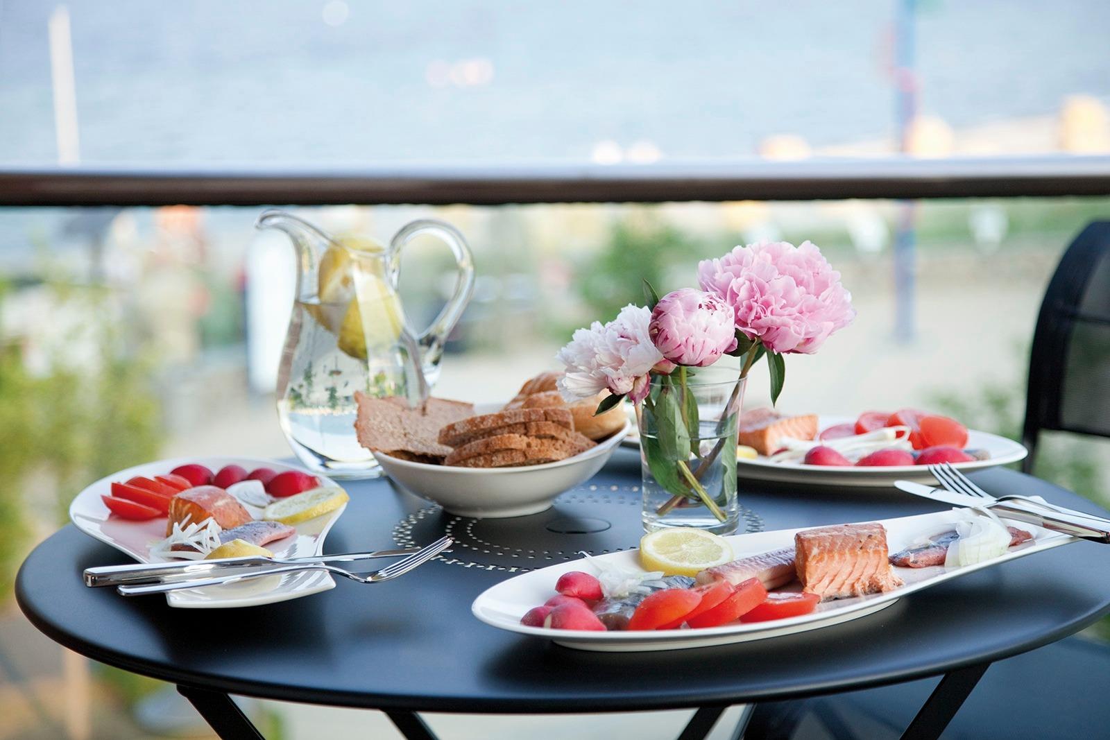 Aus dem Wohn-Essraum, aber auch vom Schlafzimmer aus, haben Sie einen wunderschönen Blick auf das nahe Strandtreiben über die Ostsee bis zum Horizont.