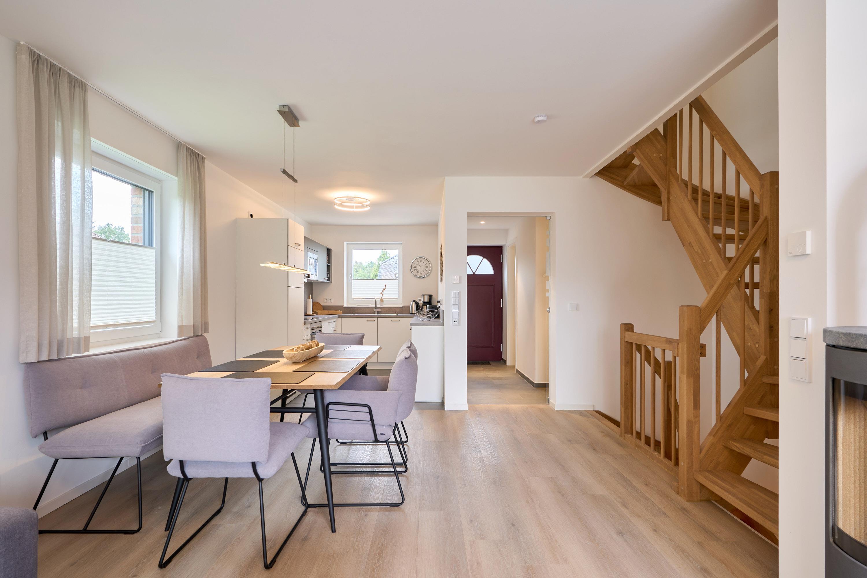 Dieses sehr ansprechende Ferienhaus hat eine Wohnfläche von ca. 100 m² und ist auf zwei Etagen aufgeteilt. Der Eingangsbereich ist großzügig mit einer Garderobe und einem Tageslichtbad ausgestattet und trennt den Wohn-Essbereich mit einer Glastür. Die Küchenzeile ist großzügig in U-Form angelegt. Alles da … Geschirrspüler, Herd, Kochfeld, Kaffeemaschine, Toaster, Wasserkocher, Waschmaschine und vieles mehr. Der Essbereich bietet Platz für 6 Personen. Im Anschluss das gemütliche Wohnzimmer mit Sofa, Tisch, Relaxsessel, 55-Zoll-Smart-TV und Kamin für gemütliche Stunden in der kalten Jahreszeit. Vom Wohnzimmer aus betreten Sie die große Südterrasse.