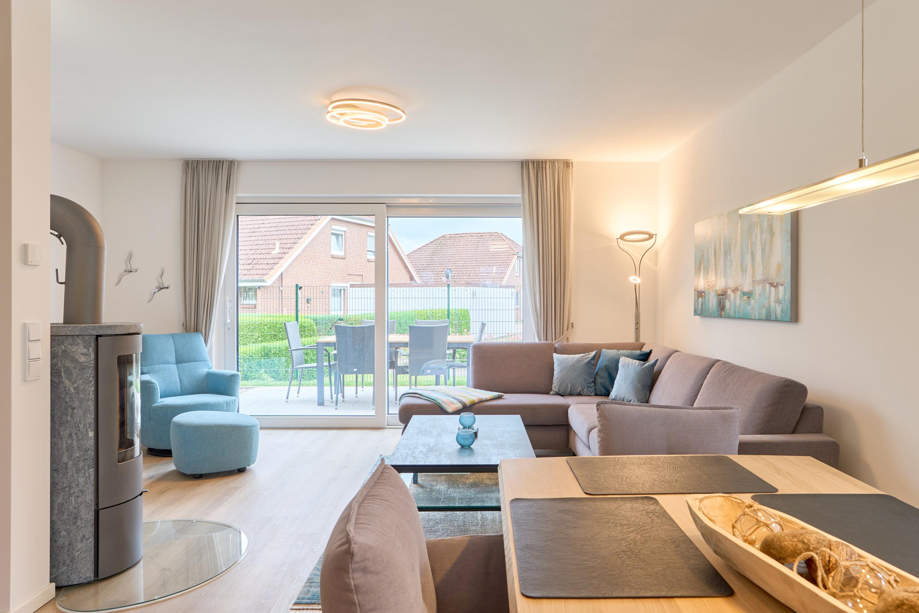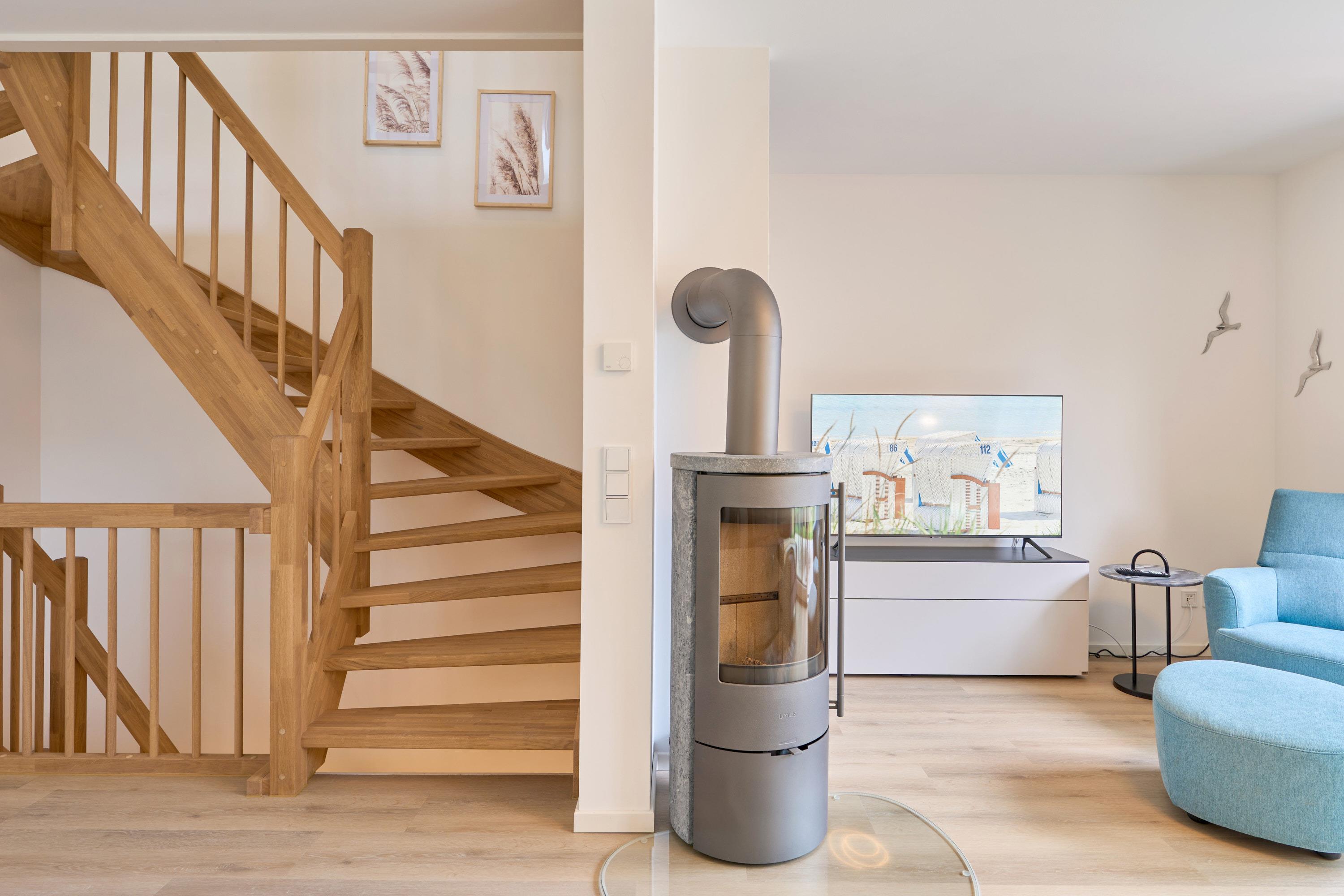 Dieses sehr ansprechende Ferienhaus hat eine Wohnfläche von ca. 100 m², auf zwei Etagen aufgeteilt. Der Eingangsbereich ist großzügig mit einer Garderobe und einem Tageslichtbad ausgestattet und trennt den Wohn-Essbereich mit einer Glastür. Die Küchenzeile ist großzügig in U-Form angelegt. Alles da … Geschirrspüler, Herd, Kochfeld, Kaffeemaschine, Toaster, Wasserkocher, Waschmaschine und vieles mehr. Der Essbereich bietet Platz für 6 Personen. Im Anschluss das gemütliche Wohnzimmer, mit Sofa, Tisch, Relaxsessel und einem 55"-Smart-TV und einem Kaminofen für die kalte Jahreszeit. Vom Wohnzimmer haben Sie Zugang zur Südterrasse, mit Gartenmöbeln und Sonnenschirm.