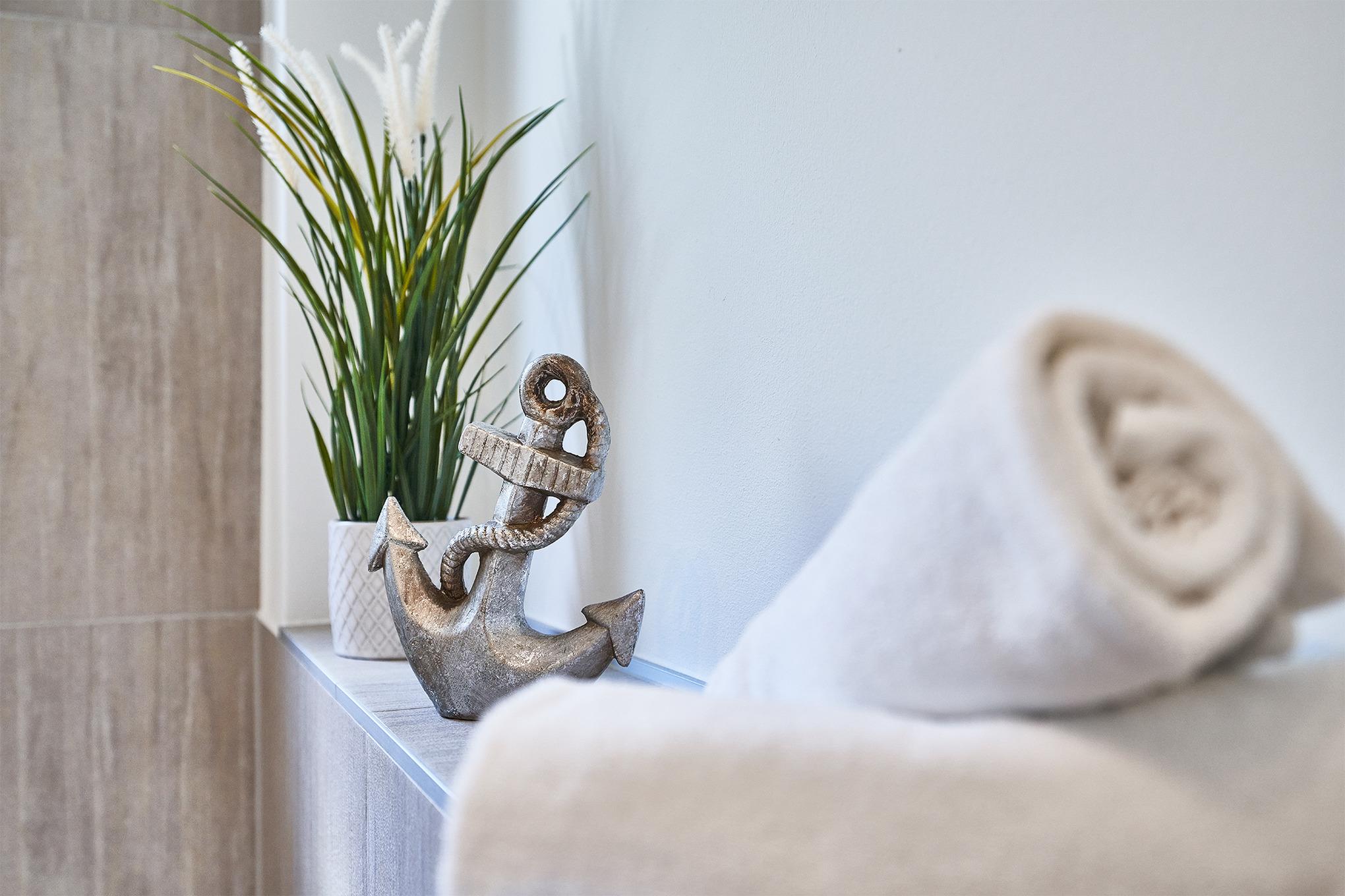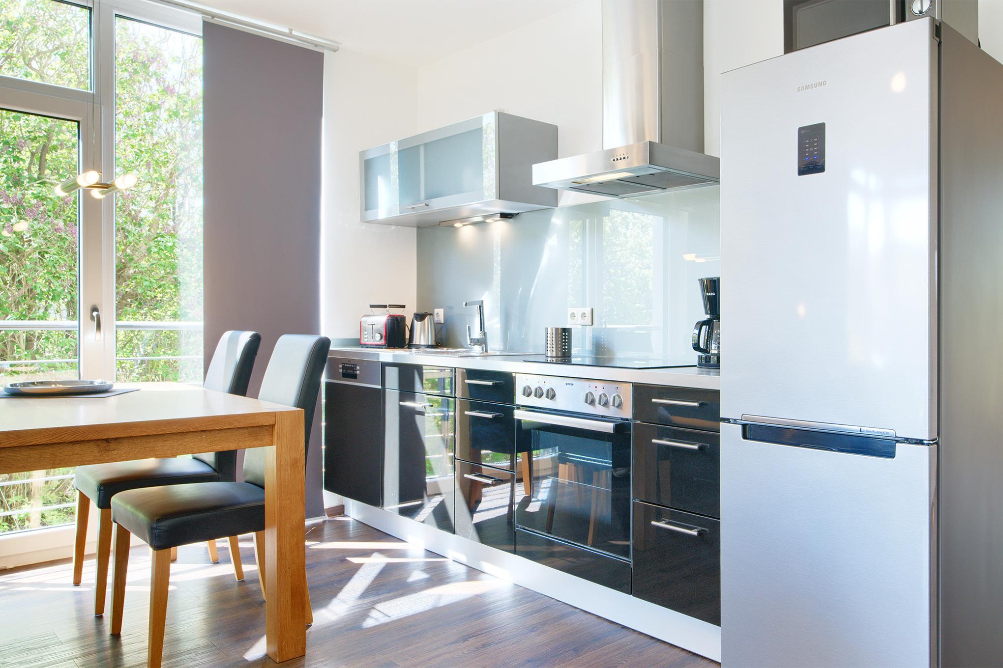 Diese moderne Ferienwohnung ist geschmackvoll und harmonisch eingerichtet. Der Wohnbereich ist mit einem Sofa ausgestattet, welches in wenigen Handgriffen zu einem bequemen Schlafsofa (1,60 x2,00m, mit Lattenrost ) umfunktioniert werden kann. Der Essbereich lädt zum gemütlichen Essen oder auch zu einem spannenden Spieleabend ein. Technisch bietet Ihnen das Wohnzimmer einen Smart-TV, eine Stereoanlage, kostenloses WLAN ist selbstverständlich. Die offene Küche ist komplett eingerichtet und besticht zusätzlich mit einer Kaffeemaschine, einer Senseo, einer Spülmaschine, einer Mikrowelle und einer Kühl-Gefrier-Kombi. Das Schlafzimmer ist mit einem Boxspringbett (1,80 x 2,00m), mit einer durchgehenden Matratze, und einem Smart-TV sowie mit einem Kleiderschrank ausgestattet. Das tageslichtdurchflutete Badezimmer verfügt über eine Eckbadewanne mit Regendusche, einen Föhn, einen Kosmetikspiegel und einen Handtuchheizkörper.
