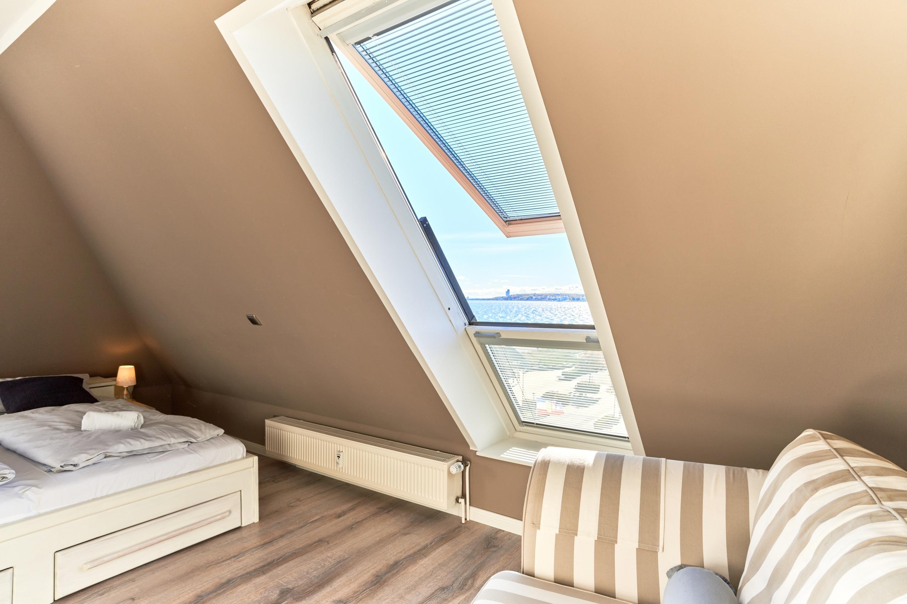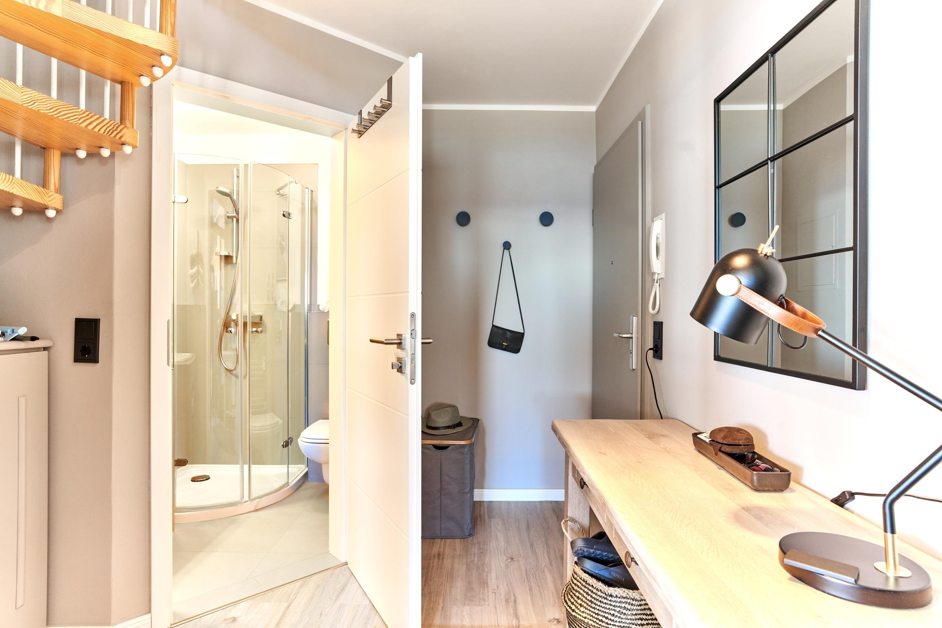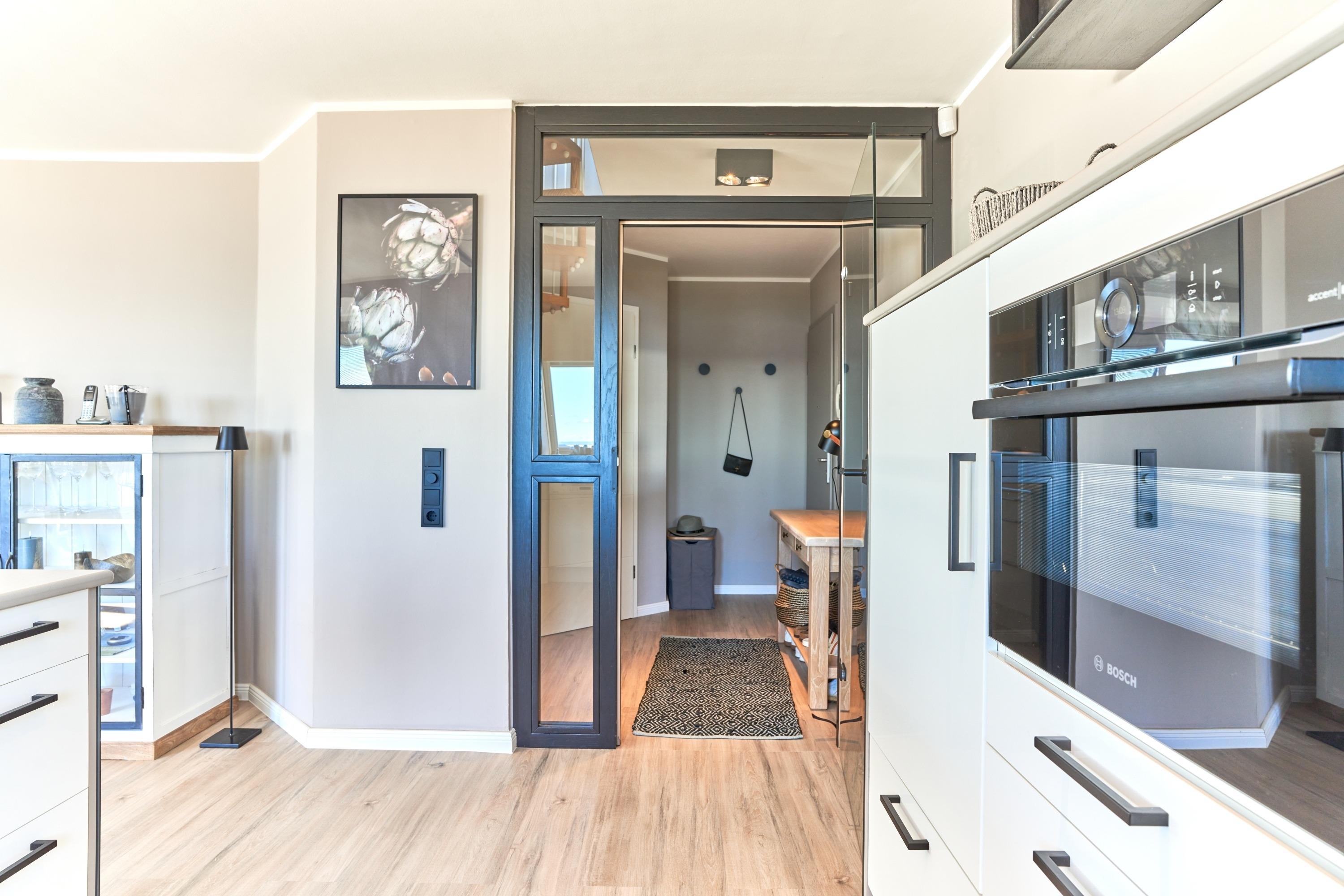 Die ca. 60 m² Ferienwohnung verteilt sich auf zwei Ebenen. In unteren Teil empfängt Sie ein kleiner Flurbereich bis Sie dann den Wohn-/Essbereich mit ansprechender Wohnzimmergarnitur und Flachbildfernseher, mit offener Küche und Essecke betreten. Die Panoramafenster bieten einen atemberaubenden Blick auf die Ostsee und die ganze Lübecker Bucht. Toller Esstresen sowie eine hochwertige Küchenzeile - hier werden Sie mit einem hohen Anspruch verwöhnt: Thermomix, Kaffee- sowie Nespresso-Maschine, Induktionsherd mit Kochfeldabzug, Mikowelle, Backofen, Spülmaschine und vieles mehr. Über eine Wendeltreppe gelangen Sie in das Schlafzimmer und einem weiteren Duschbad. Ein Einbauschrank und ein Sideboard bieten Platz für Ihre Kleidung. Besonderes Highlight hier: beide Fenster lassen sich mit weinigen Handgriffen zu einem ausklappbaren Balkon umgestalten. Ostseeblick pur!