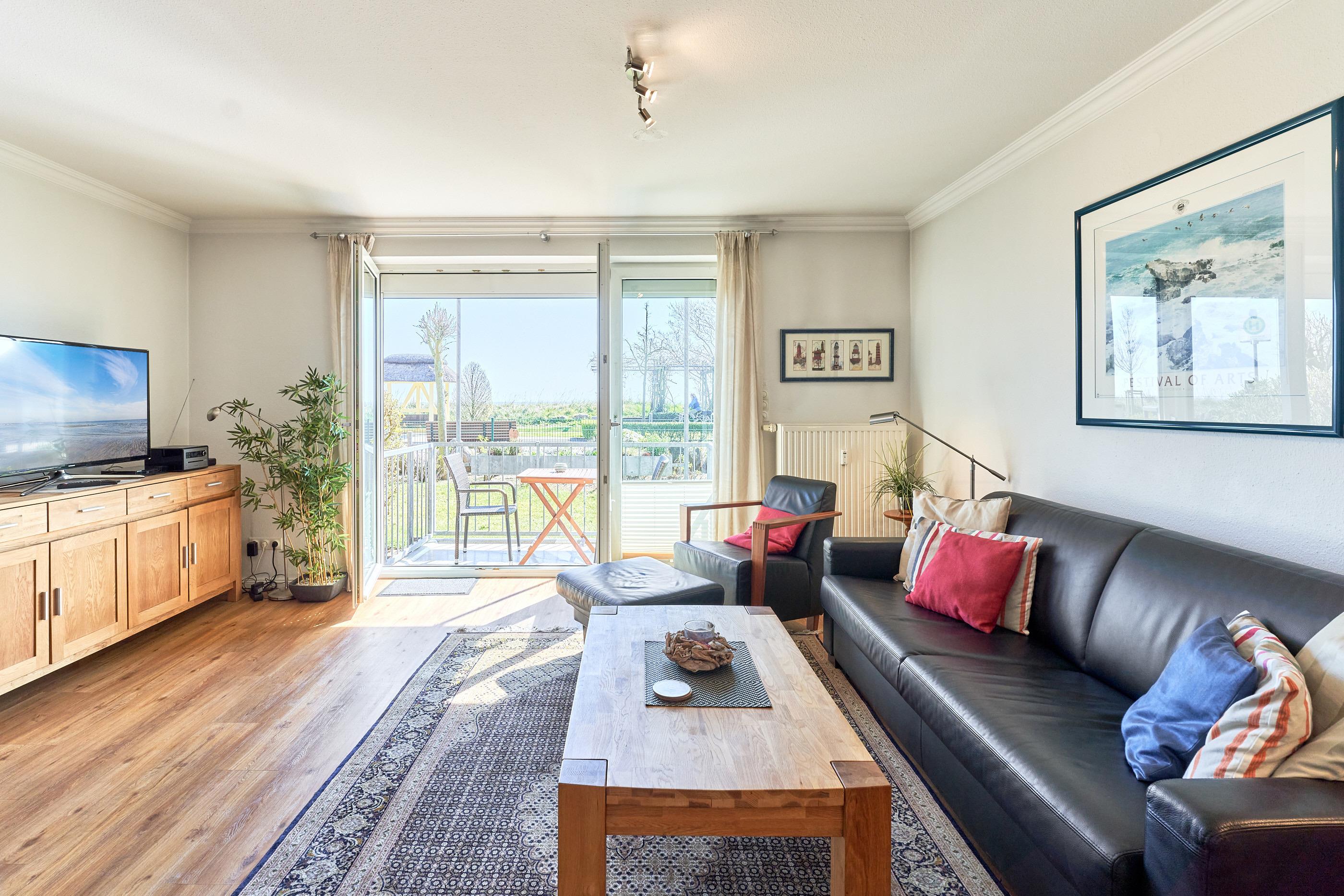 Der gemütliche Wohn-Essbereich verfügt über einen 3-D-Flachbildfernseher, DVD-Player, CD-Player und WLAN. Eine Ledercouch lädt zum gemütlichen Verweilen ein und ist in wenigen Handgriffen zu einem Doppelbett mit gesonderter Matratze ausklappbar. Auf dem Balkon können Sie in der Morgensonne Ihr Frühstück genießen. Der Esstisch bietet ausreichend Platz für gemütliche Stunden. Die offene Küche ist ausgestattet mit Backofen, Ceranfeld, Kühlschrank, Gefrierfach, Geschirrspüler, Kaffeemaschine, Wasserkocher, Toaster u.v.m.