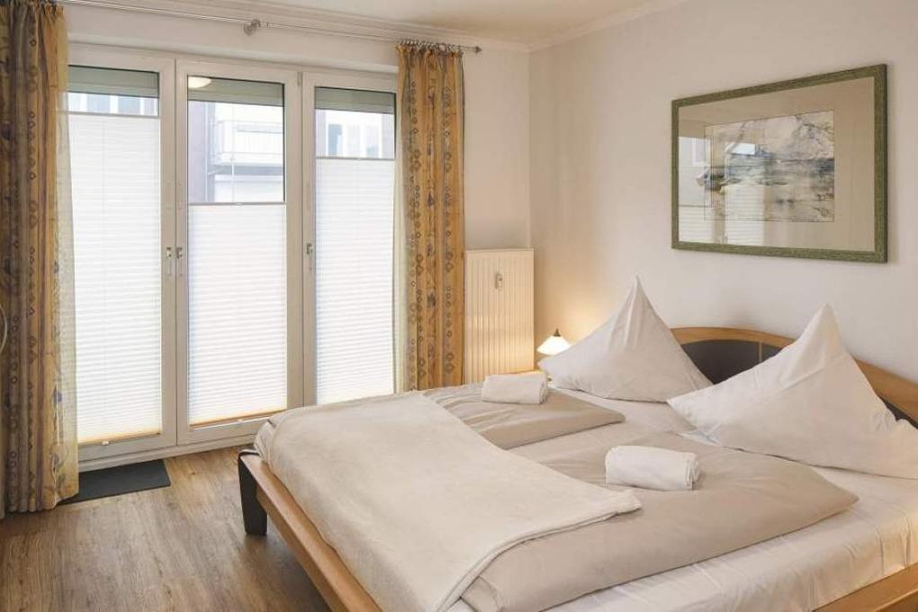 Das Schlafzimmer verfügt über ein Doppelbett und einen geräumigen Kleiderschrank. Hier finden Sie den zweiten Balkon Richtung Westen. Zur Verdunkelung sind elektrische Rollläden angebracht. Im Duschbad finden Sie einen großen Waschtisch sowie die zur Ferienwohnung gehörende Waschmaschine.