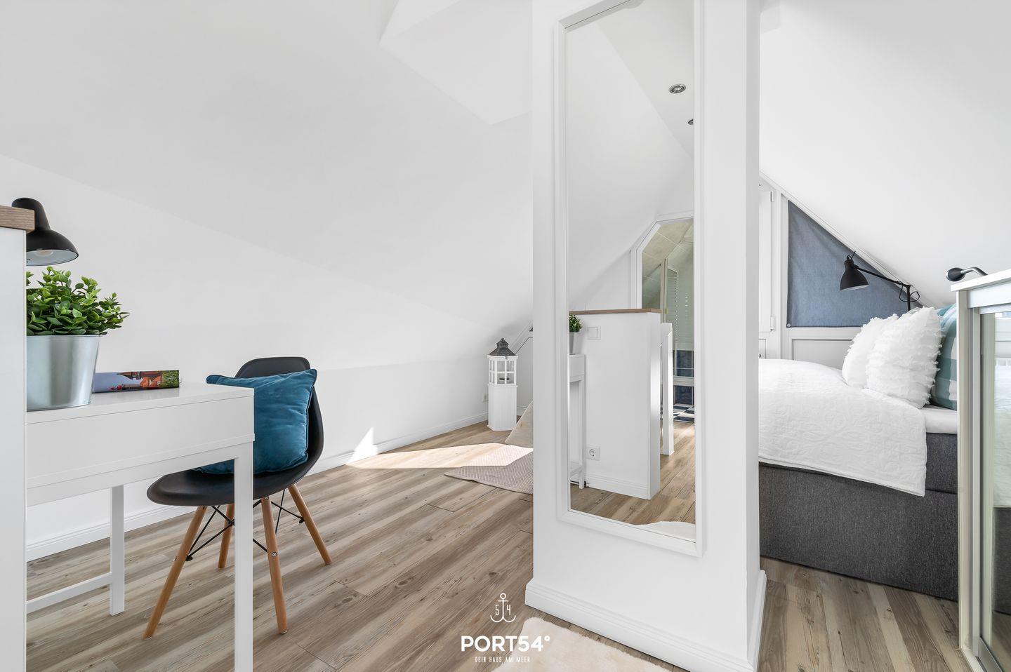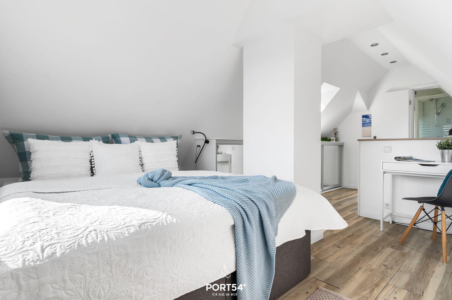 Das Schlafzimmer ist mit einem luxuriösen Boxspringbett (1,60 x 2,00 m) und einem geräumigen Kleiderschrank ausgestattet. Die Bettwäsche ist bei Buchung obligatorisch. Handtücher und sonstige Frottierwaren bringst du bitte selbst mit.