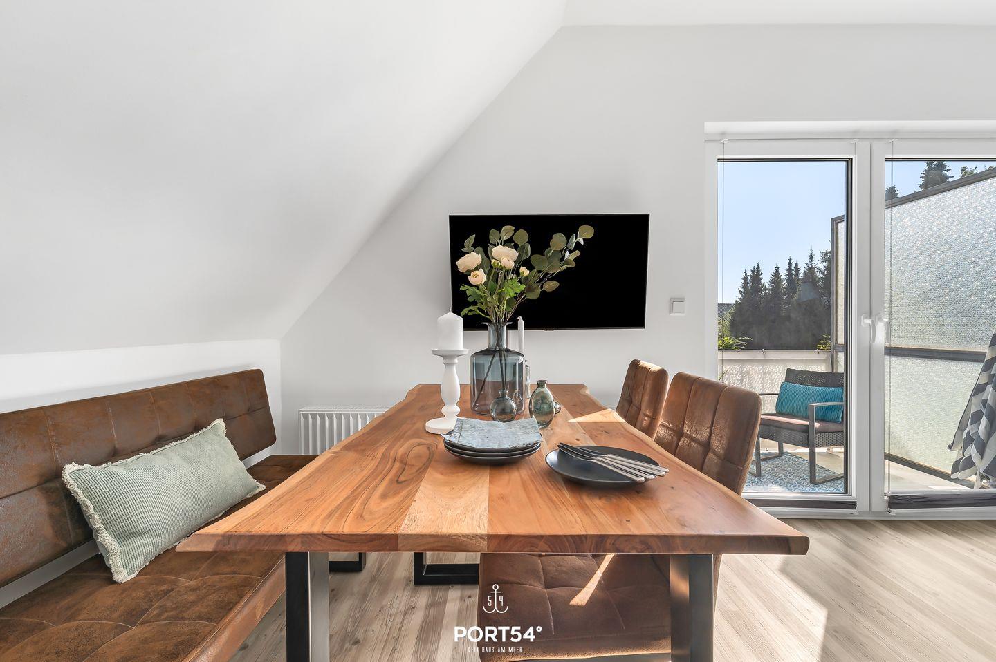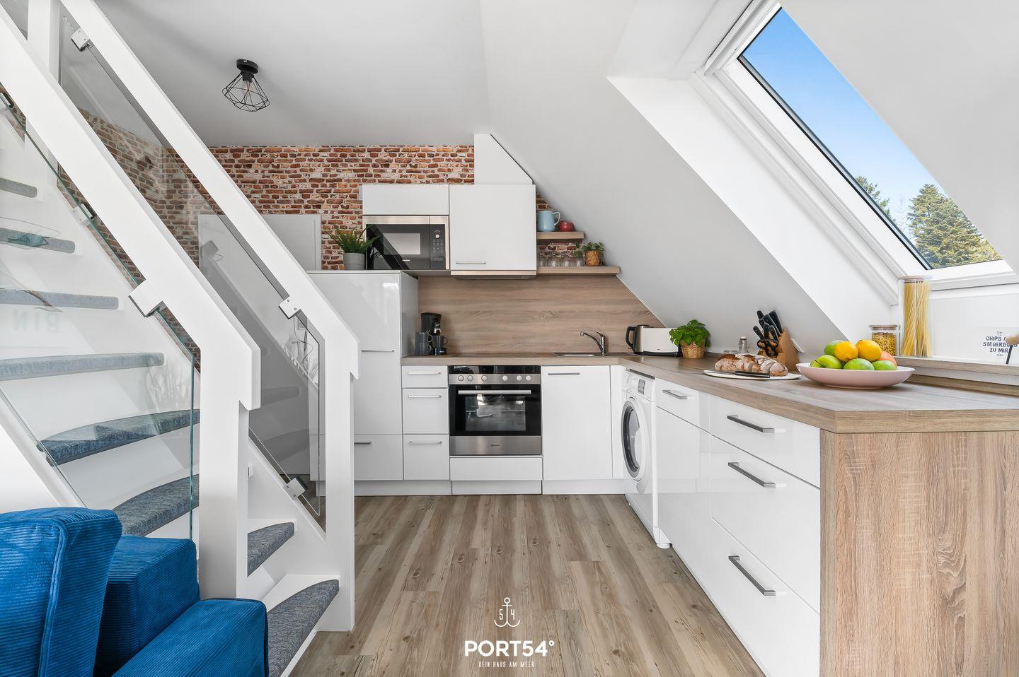 Im Inneren erwartet dich eine moderne und stilvolle Einrichtung. Die offene Wohnküche mit Essbereich lädt zum gemeinsamen Kochen und Genießen ein. Die Küche ist komplett ausgestattet mit Ceran-Kochfeld, Backofen, Geschirrspüler, Kühlschrank mit Gefrierfach, Kaffeemaschine, Wasserkocher, Mikrowelle, Toaster und einer Waschmaschine. Der Balkon eignet sich im Sommer perfekt für ein Frühstück unter freiem Himmel (im Winter müssen die Balkonmöbel witterungsbedingt eingelagert werden).