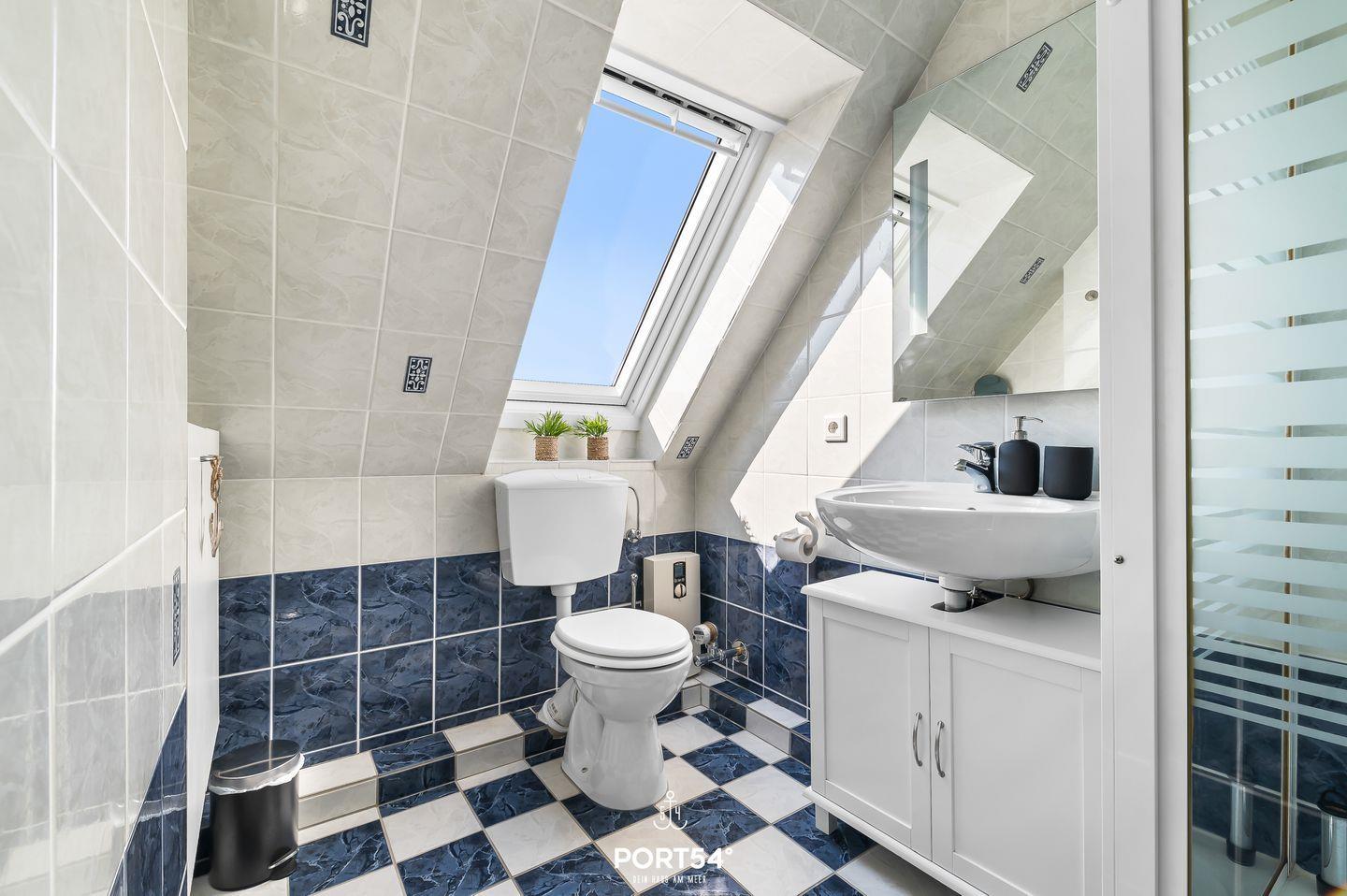 Das Badezimmer mit Tageslicht verfügt über eine Dusche, ein WC und ein Waschbecken.
