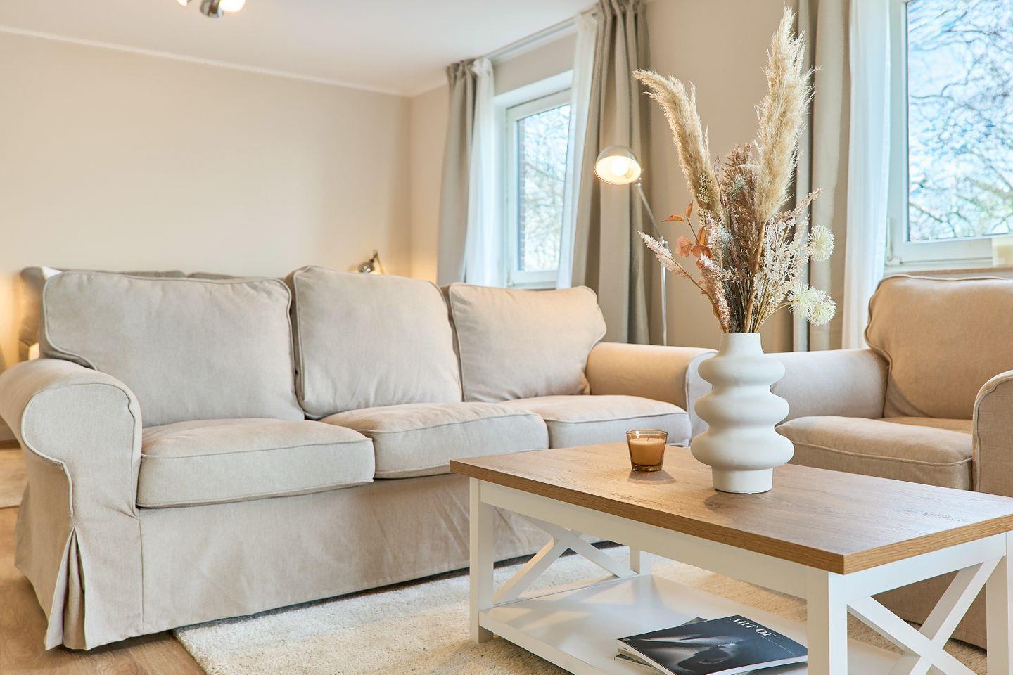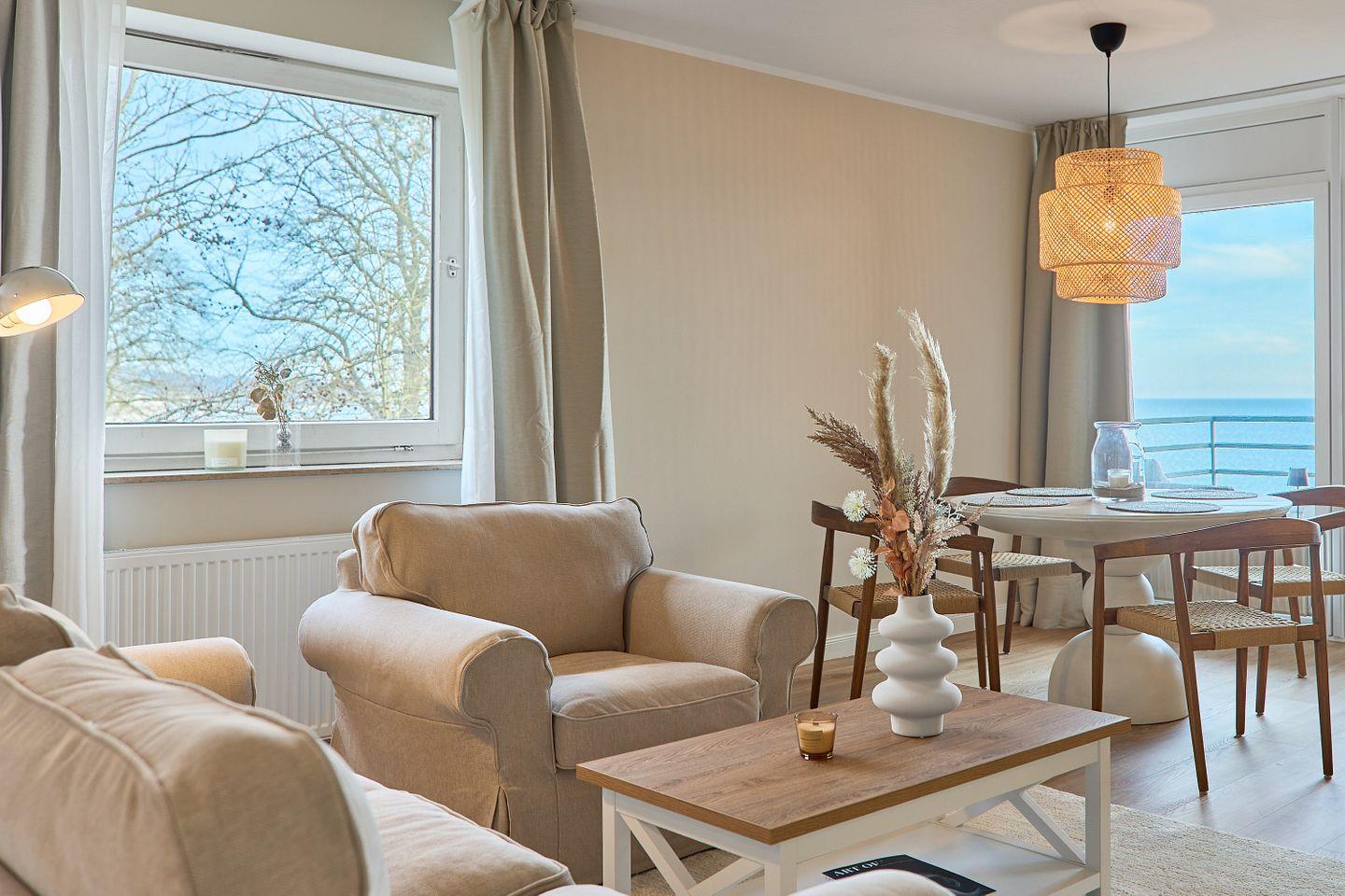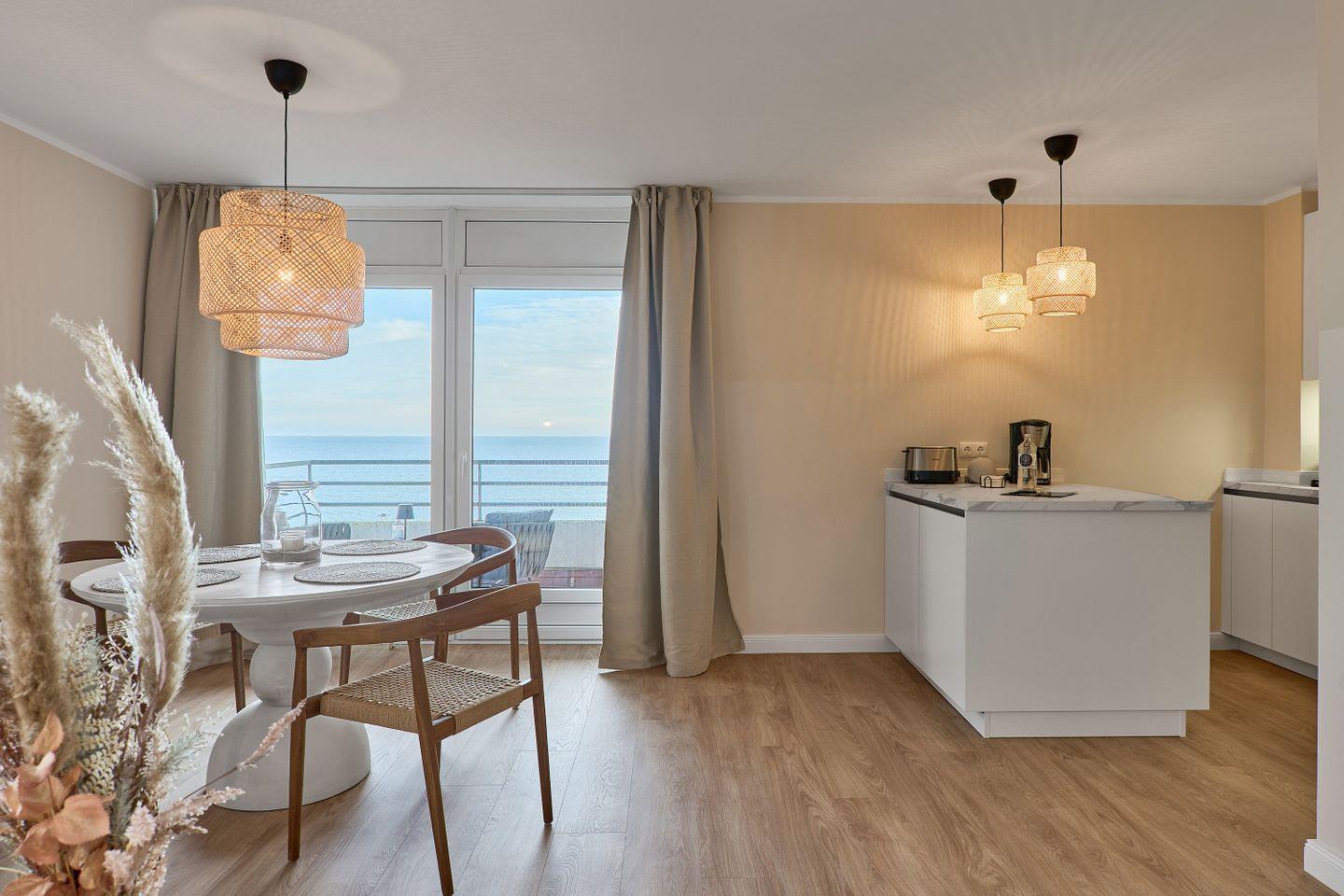 Die Ferienwohnung begeistert mit stilvoller, liebevoll durchdachter Einrichtung und einer komplett ausgestatteten Küche, die zum gemeinsamen Kochen einlädt. Der offene, lichtdurchflutete Wohn- und Essbereich schafft eine einladende Atmosphäre zum Verweilen und Entspannen. Starten Sie Ihren Tag mit einem köstlichen Espresso aus der Nespresso-Maschine auf dem Balkon und genießen Sie den Blick auf das glitzernde Meer – der perfekte Ort, um den Sonnenaufgang über der Ostsee zu erleben.