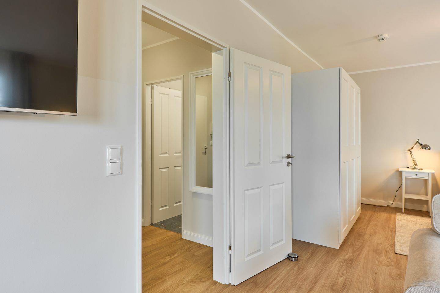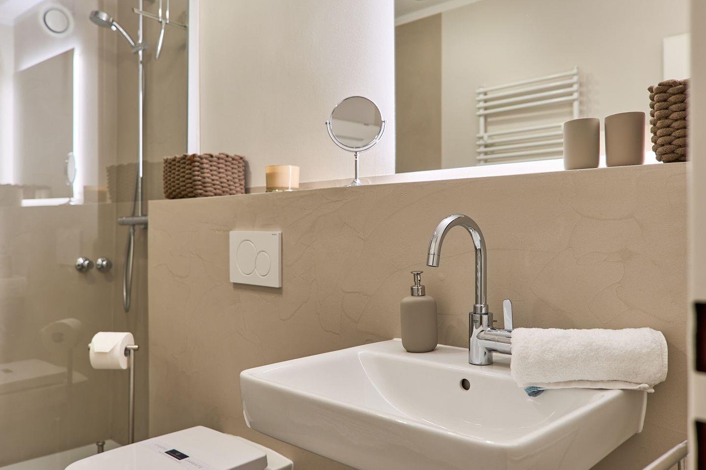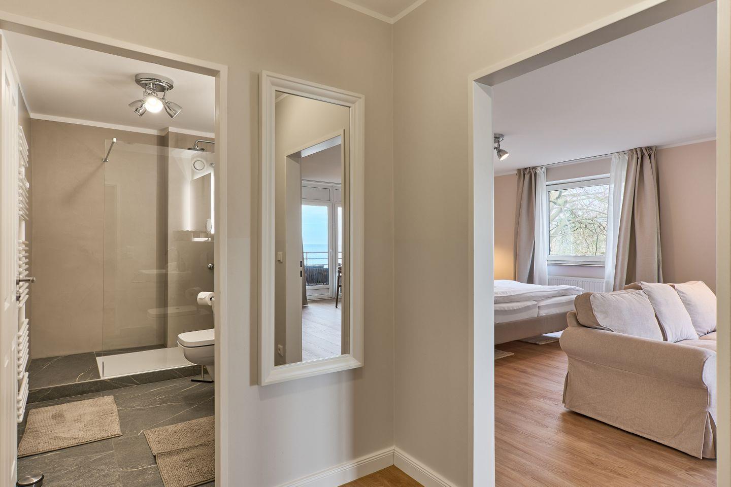 Das komfortable Wohn/Schlafzimmer ist mit hochwertigen Geltexmatratzen ausgestattet und garantiert eine erholsame Nachtruhe. Das moderne Badezimmer mit eleganten Armaturen und einer großzügigen Dusche bietet Ihnen nach einem Strandtag die perfekte Erfrischung.