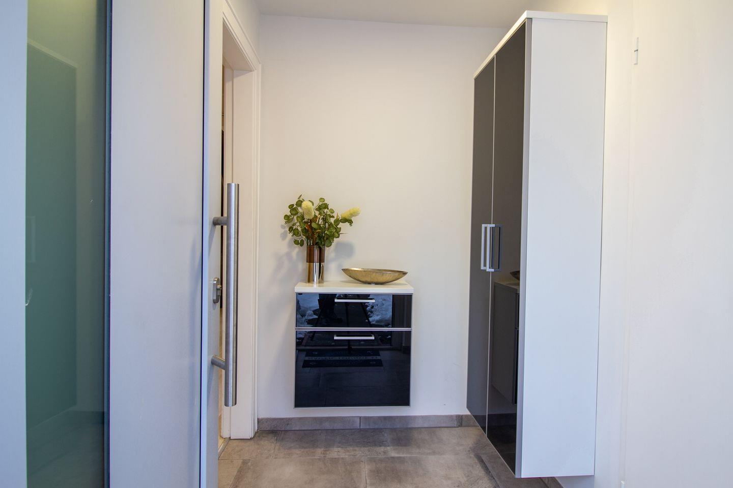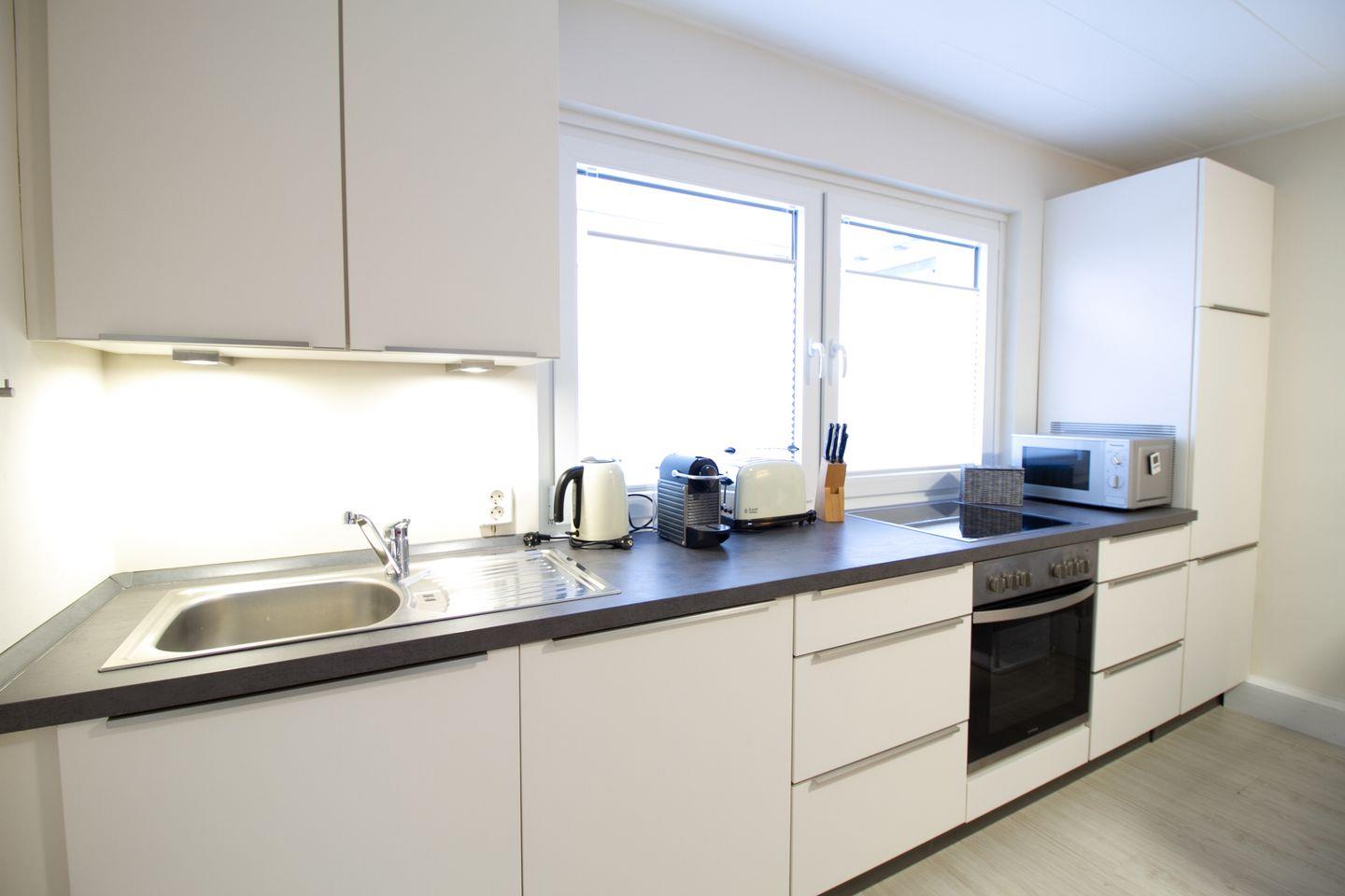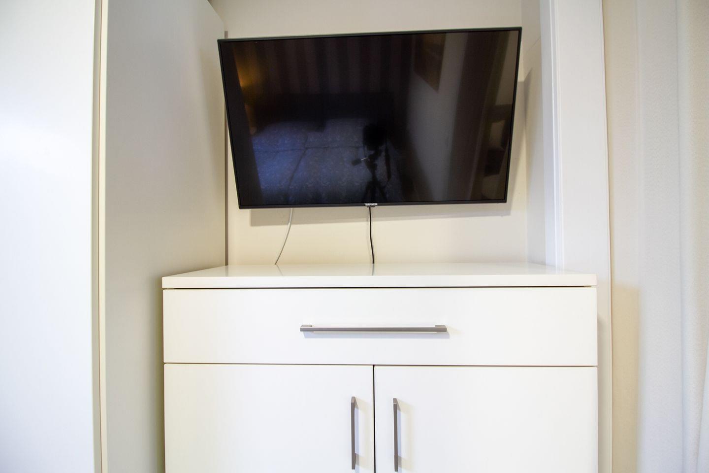 Vom Eingangsbereich mit einem Garderobenschrank gelangt man in den Wohnbereich mit einer offenen großen Küche. Das Schlafzimmer befindet sich direkt nebenan und ist durch einen Vorhang vom Wohnbereich abgetrennt. Es verfügt über ein komfortables Boxspring-Bett (1,80 x 2,00 m), einen geräumigen Kleiderschrank und einen Flachbild-Smart-TV.