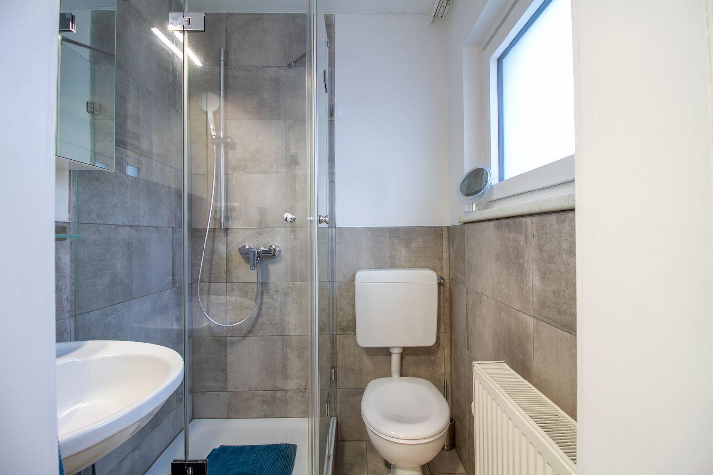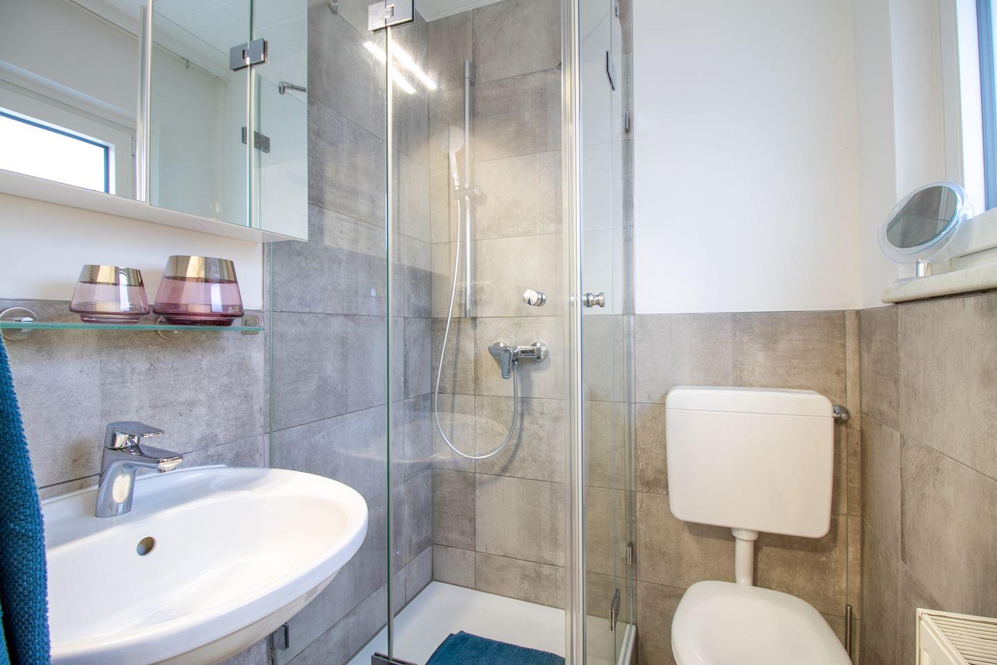 Im neu gestalteten Tageslicht-Badezimmer gibt es eine Dusche, ein WC und ein Waschbecken.