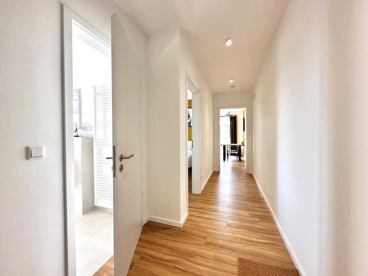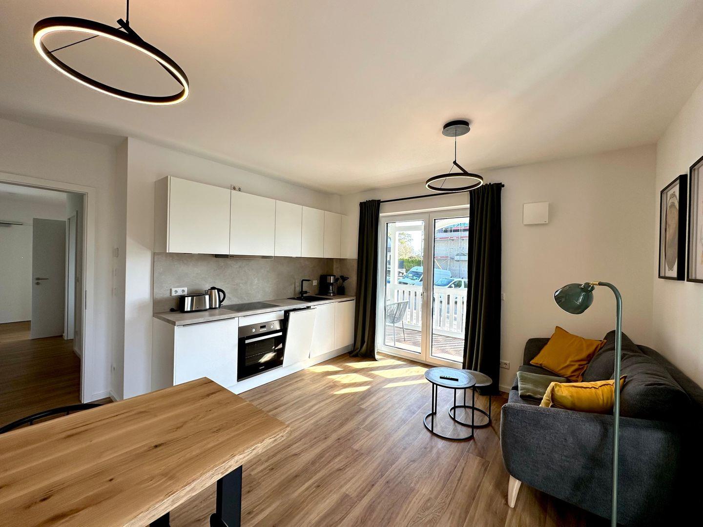 Verbringen Sie einen erholsamen Urlaub in dieser 2025 fertiggestellten, ca. 47?m² großen 2-Zimmer-Ferienwohnung im Hochparterre. Das Schlafzimmer, der Wohn- und Essbereich mit offener Küche sowie das helle Duschbad mit bodentiefen Fenstern bieten komfortablen Platz für zwei Erwachsene und ein Kleinkind. Vom gemütlich eingerichteten Wohnbereich mit TV und Essecke gelangen Sie direkt auf zwei möblierte Balkone. Der große Fernseher eignet sich hervorragend für entspannte Filmabende auf dem Sofa.