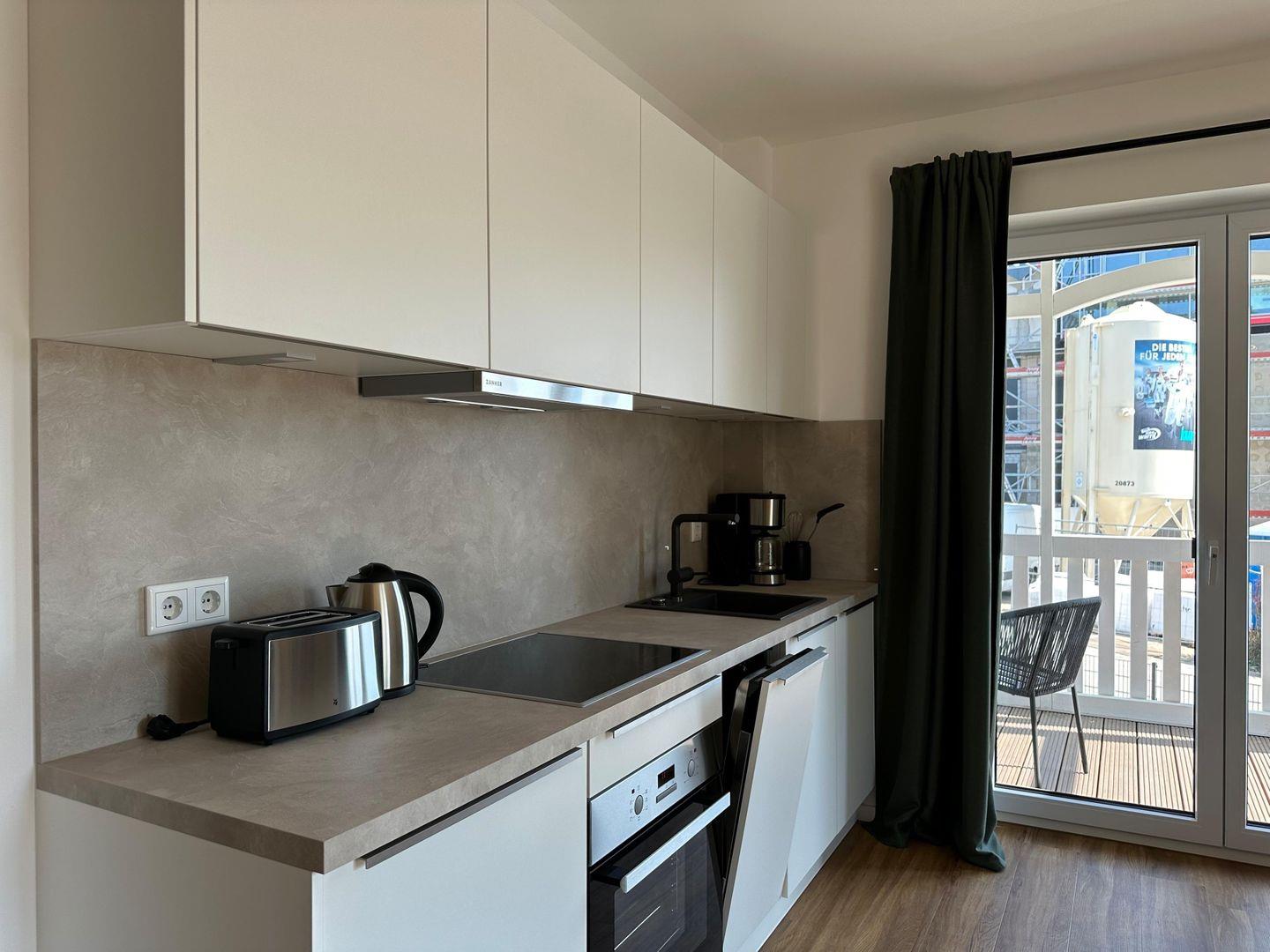 Die moderne, gut ausgestattete Küche mit Herd, Spülmaschine und Kaffeemaschine fügt sich harmonisch in den Raum ein; perfekt, um auch im Urlaub leckere Gerichte zuzubereiten.