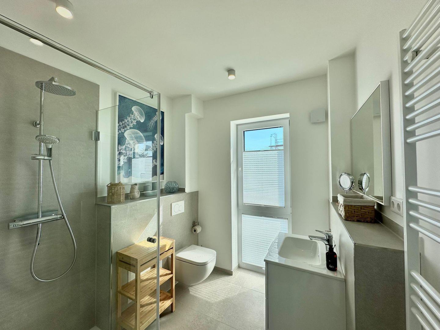 Das helle Duschbad ist mit einem bodentiefen Fenster ausgestattet und vom Flur aus erreichbar; ebenso wie das Schlafzimmer.