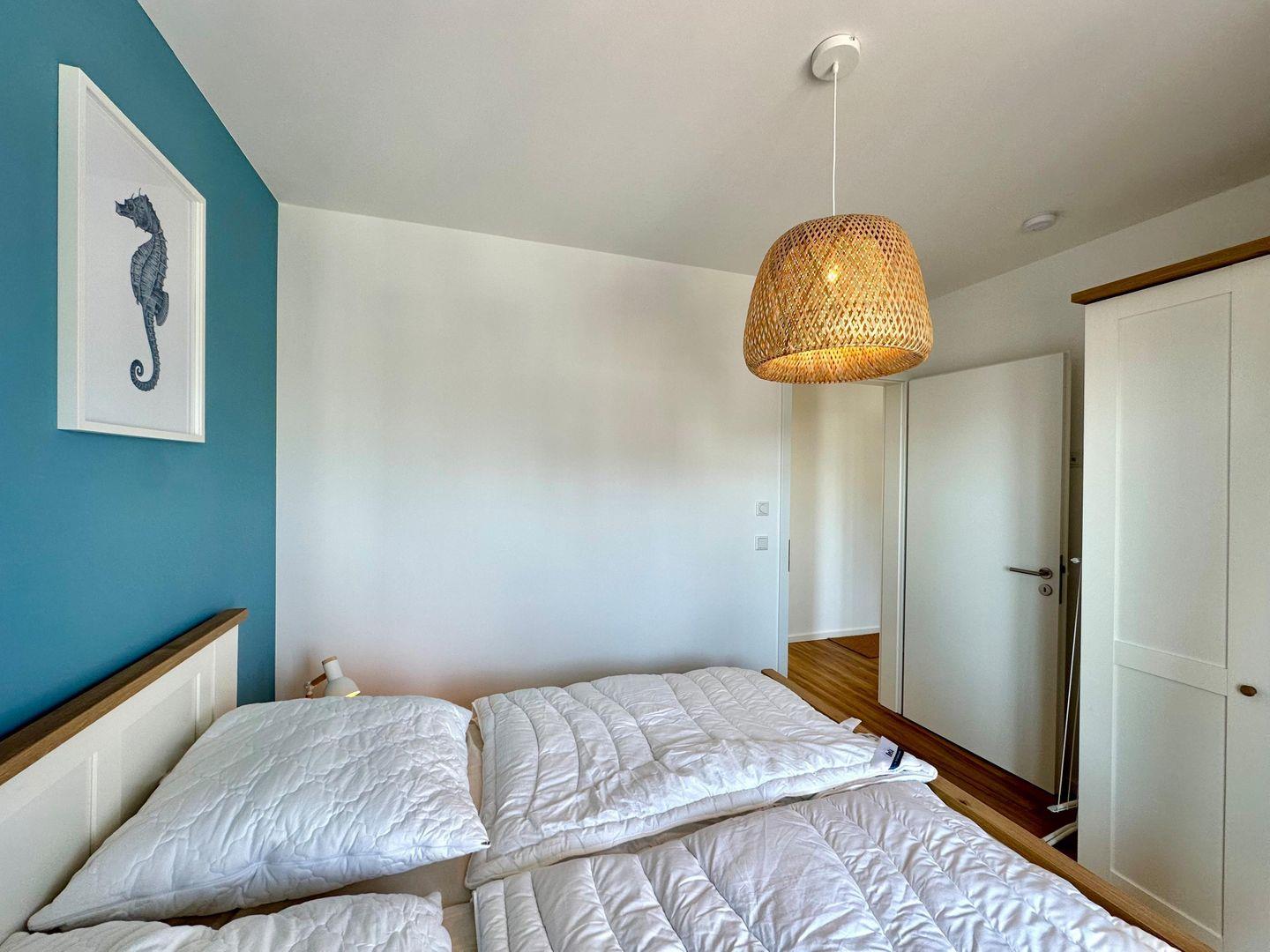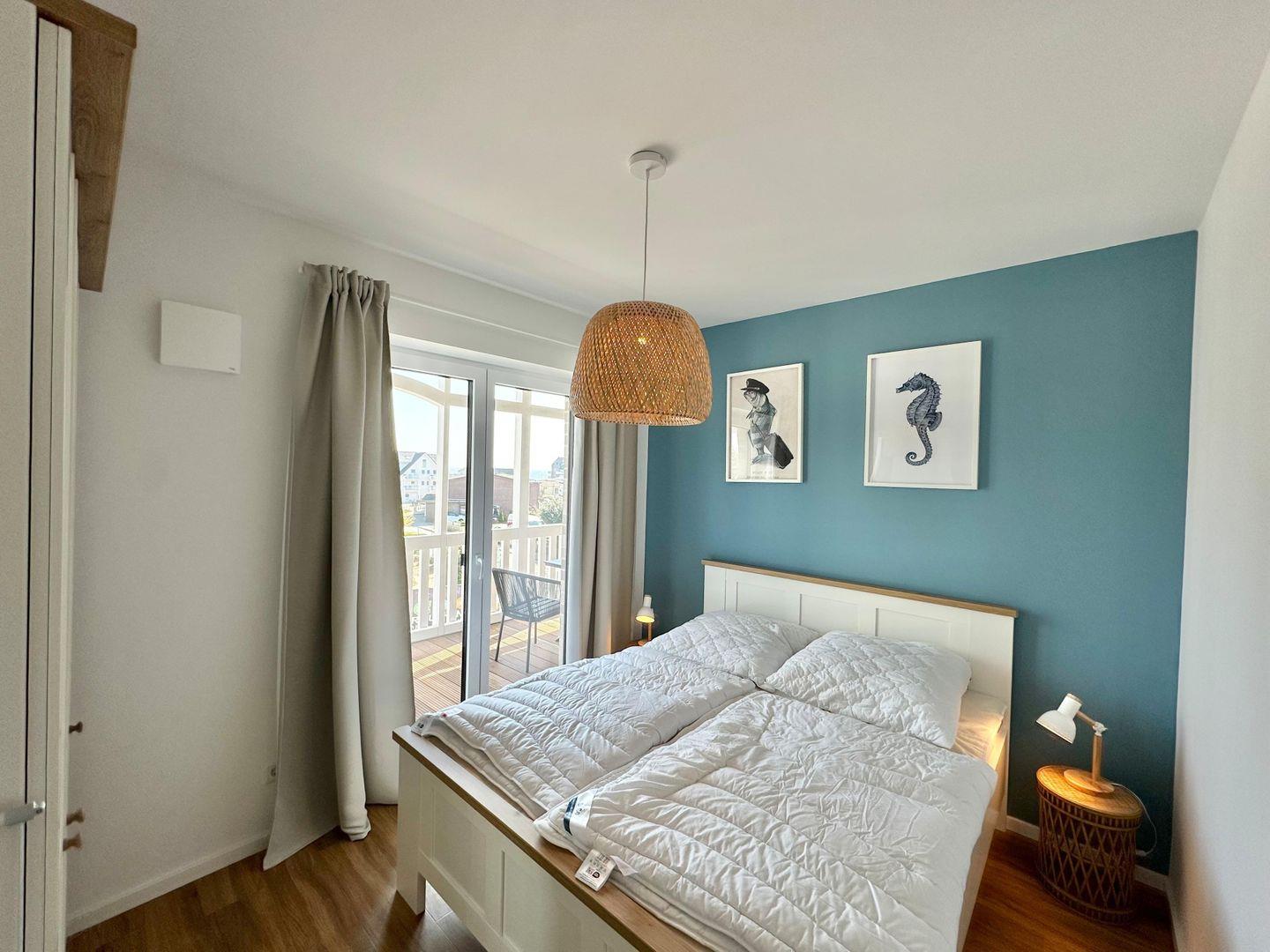 Das separate Schlafzimmer ist ebenfalls in ruhigen Blautönen gestrichen und bietet ein Doppelbett (160?×?200?cm), einen Kleiderschrank und zwei Nachttische. Von hier aus gelangen Sie direkt auf einen der beiden möblierten Balkone.