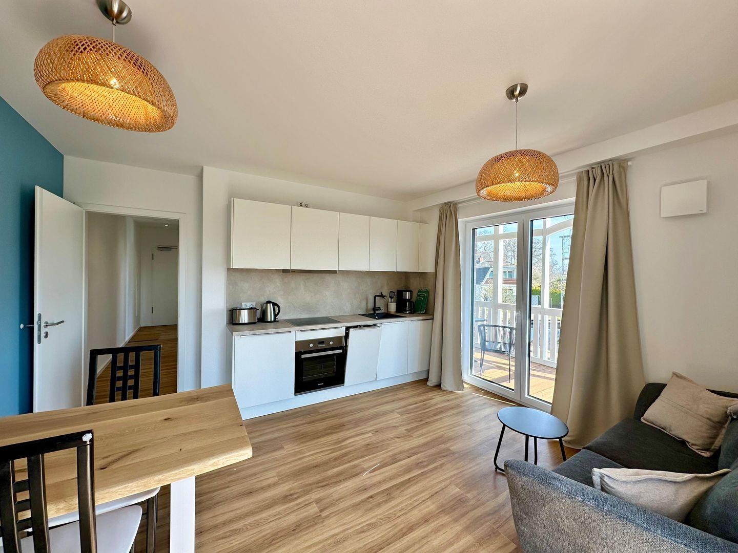 Der offene Wohn- und Essbereich ist geschmackvoll in Blautönen gehalten und wird durch maritime Bilder stimmungsvoll ergänzt. Der große Fernseher sorgt für entspannte Abende; ganz gleich, ob Sie ihn vom Sofa oder vom Esstisch aus nutzen möchten. Die gut ausgestattete Küche lädt dazu ein, auch im Urlaub unkompliziert zu kochen.