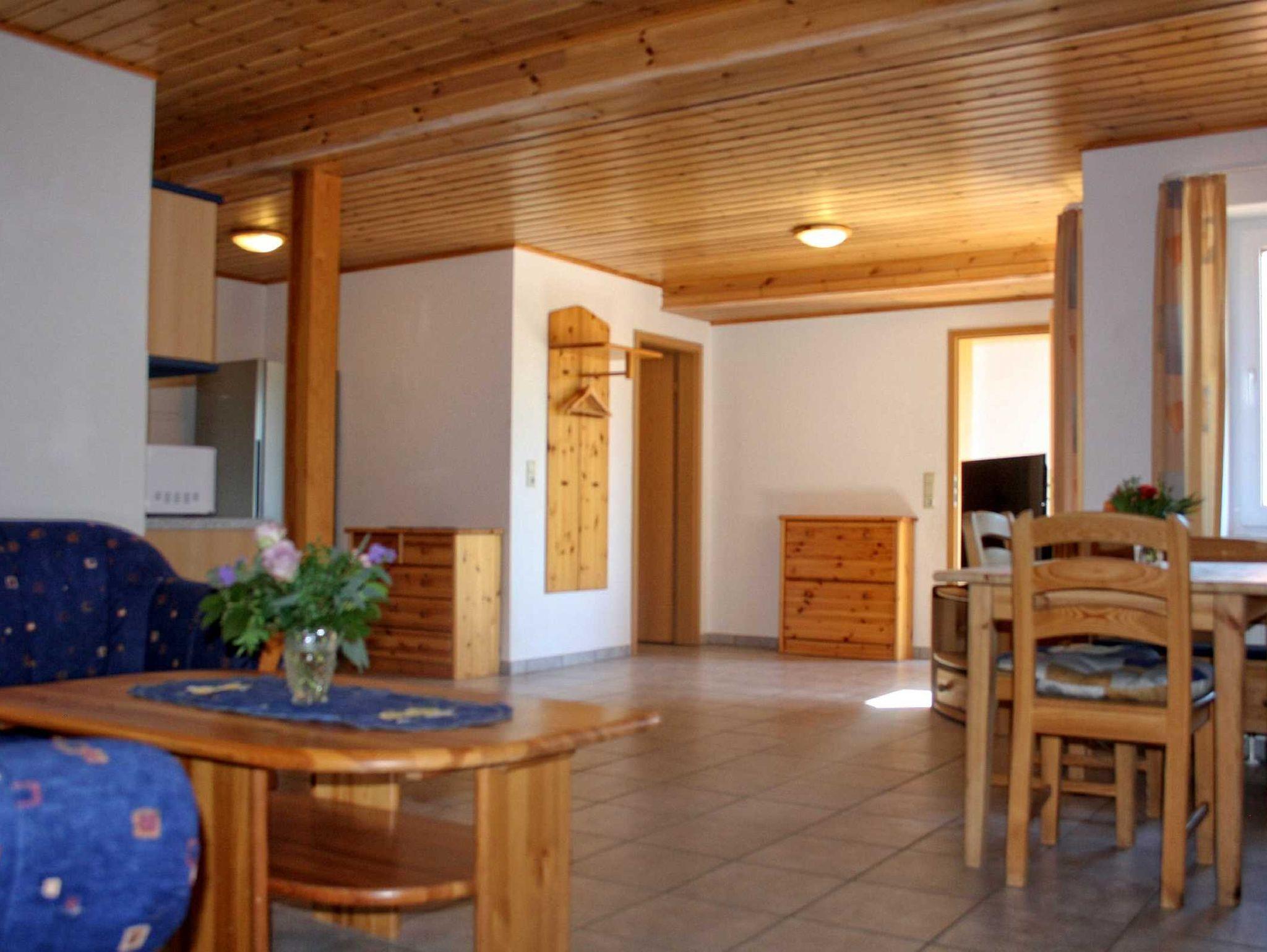 Helle Komfort-Ferienwohnung (75 qm), bestehend aus einem Schlafzimmer mit Doppelbett, einem Schlafzimmer mit zwei Einzelbetten ( auf Nachfrage auch ein Zustellbett möglich), einem Wohnraum mit offener Küche und Essecke sowie einem Duschbad. Es gibt eine möblierte Terrasse und ein Carport zum Unterstellen von Autos und Fahrrädern.