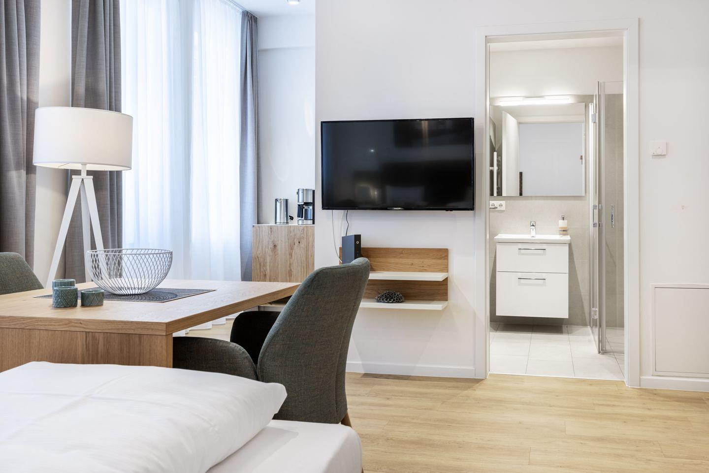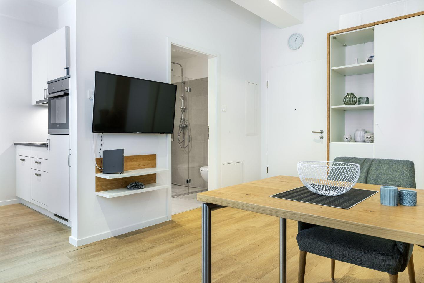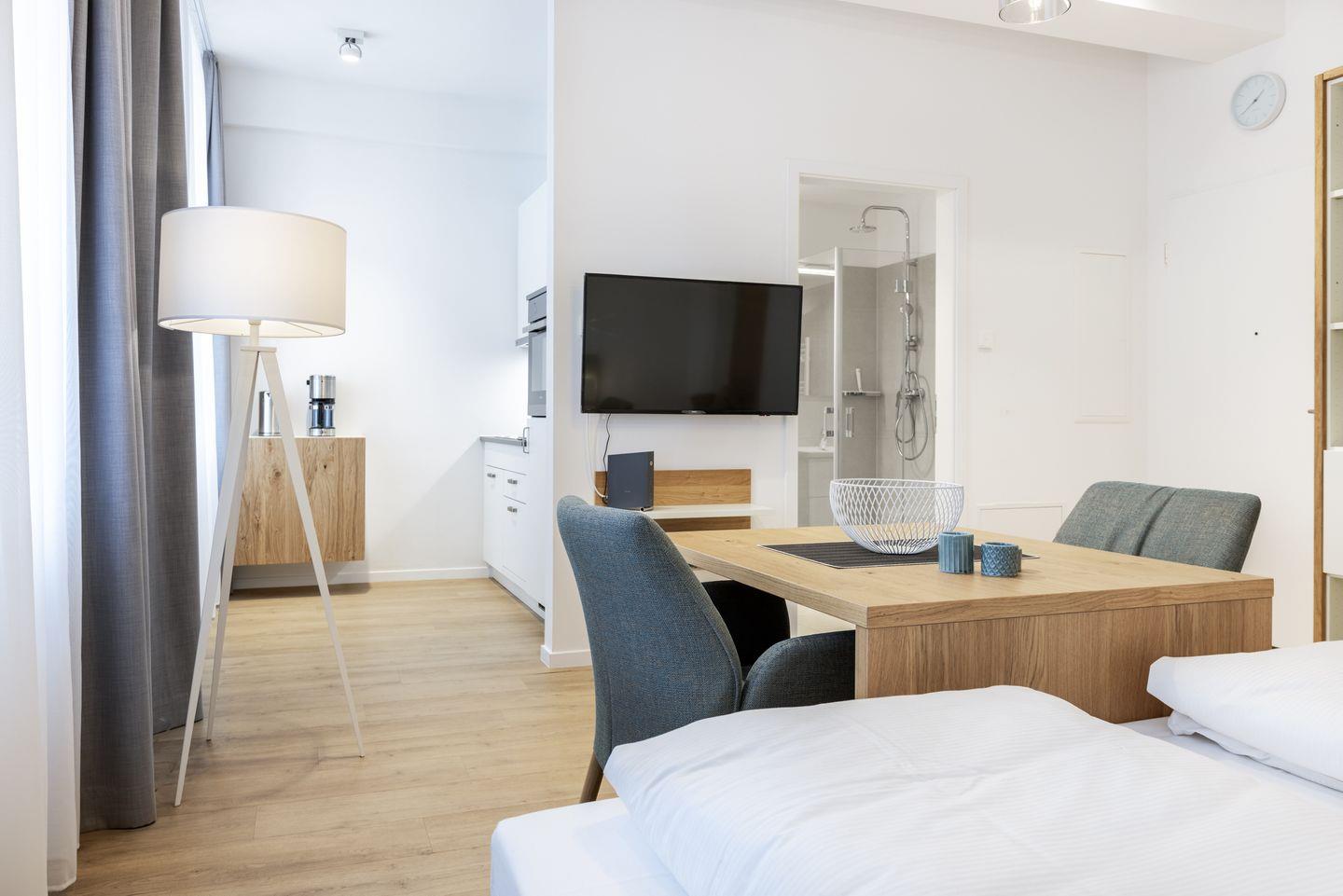 Das helle und moderne Nichtraucher-Apartment verfügt über Fußbodenheizung, kostenfreies WLAN und eine voll ausgestattete offene Küche mit Geschirrspüler, Kühlschrank, einen Herd mit 2 Glaskeramikkochfeldern und Backofen, Kaffeemaschine, Toaster, Wasserkocher und Mixstab. Im kombinierten Wohn-Schlafbereich befinden sich ein komfortables Boxspring-Doppelbett (1,80 x 2,00 m), ein Flatscreen-TV (40 Zoll) und eine Musikanlage. Das Apartment verfügt über einen Safe für Laptopgröße bis ca. 17 Zoll. Im modernen Badezimmer stehen euch eine ebenerdige Regendusche, ein Waschtisch, WC, ein Handtuchwärmer sowie ein Föhn zur Verfügung.