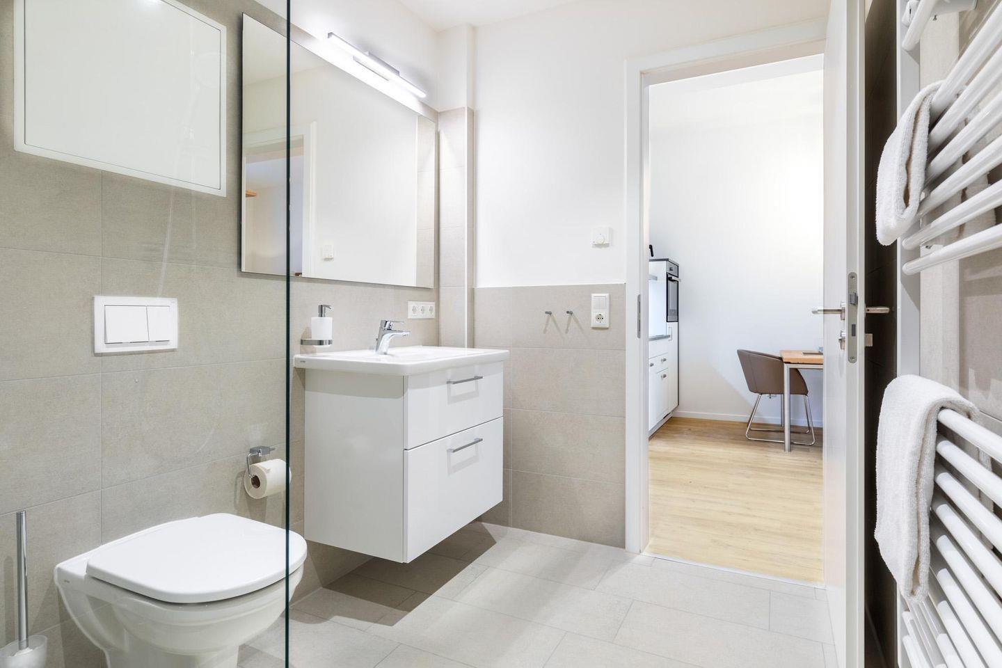 Das helle und moderne Nichtraucher-Apartment verfügt über Fußbodenheizung, kostenfreies WLAN und eine voll ausgestattete offene Küche mit Geschirrspüler, Kühlschrank, einen Herd mit 2 Glaskeramikkochfeldern und Backofen, Kaffeemaschine, Toaster, Wasserkocher und Mixstab. Im separaten Schlafzimmer befindet sich ein komfortables Boxspring-Doppelbett (1,80 x 2,00 m) und ein Flatscreen-TV (40 Zoll). Im kombinierten Wohn-Essbereich stehen euch ein Flatscreen-TV (40 Zoll) und eine Musikanlage sowie eine Einzelschlafcouch (1,20 x 1,95 m) zur Verfügung. Das Apartment verfügt über einen Safe für Laptopgröße bis ca. 17 Zoll. Im modernen Badezimmer befinden sich eine ebenerdige Regendusche, ein Waschtisch, WC, ein Handtuchwärmer sowie ein Föhn.