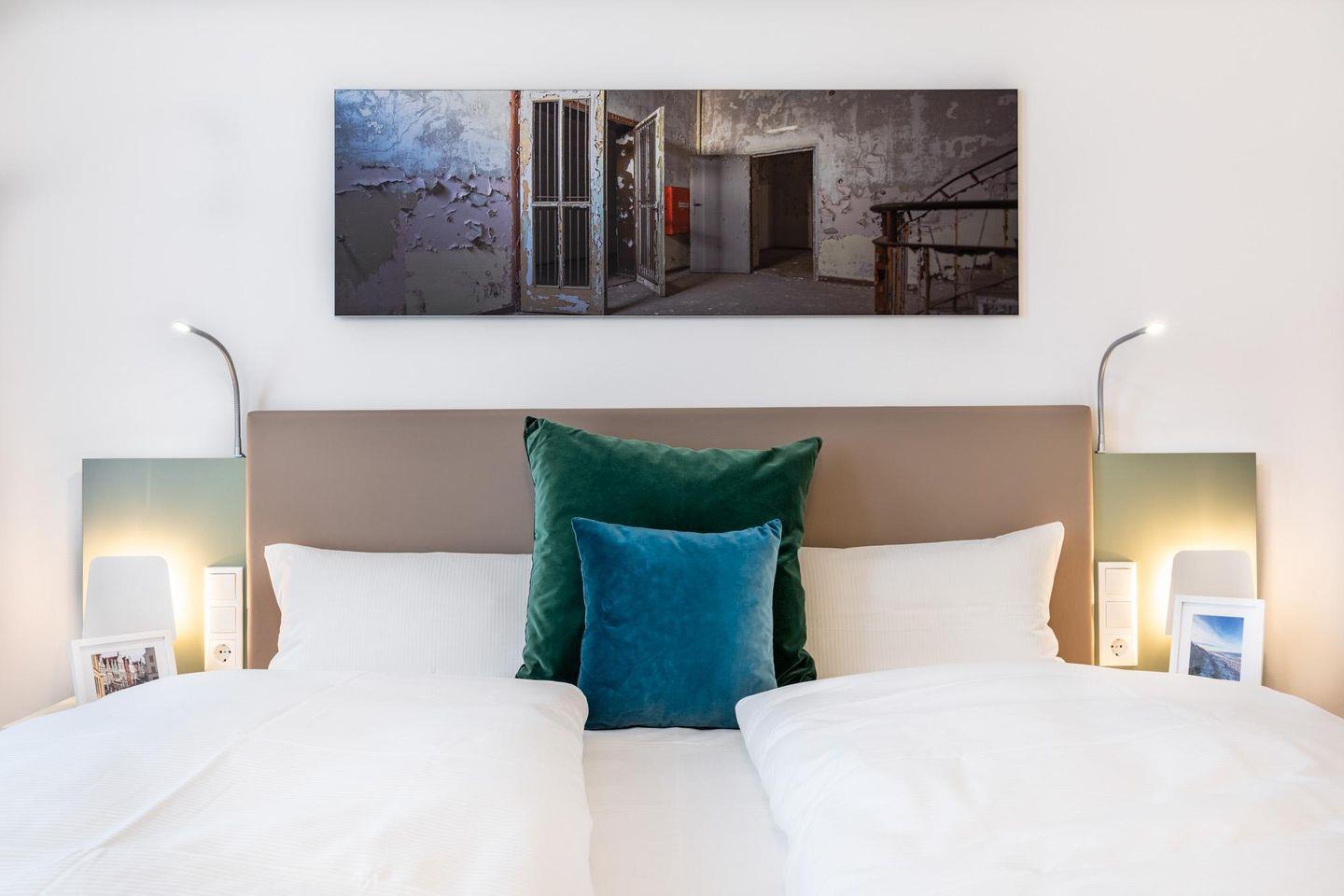 Das helle und moderne Nichtraucher-Apartment verfügt über Fußbodenheizung, kostenfreies WLAN und eine voll ausgestattete offene Küche mit Geschirrspüler, Kühlschrank, einen Herd mit 2 Glaskeramikkochfeldern und Backofen, Kaffeemaschine, Toaster, Wasserkocher und Mixstab. Im kombinierten Wohn-Schlafbereich befinden sich ein komfortables Boxspring-Doppelbett (1,80 x 2,00 m), ein Flatscreen-TV (40 Zoll) und eine Musikanlage. Das Apartment verfügt über einen Safe für Laptopgröße bis ca. 17 Zoll. Im modernen Badezimmer stehen euch eine ebenerdige Regendusche, ein Waschtisch, WC, ein Handtuchwärmer sowie ein Föhn zur Verfügung.