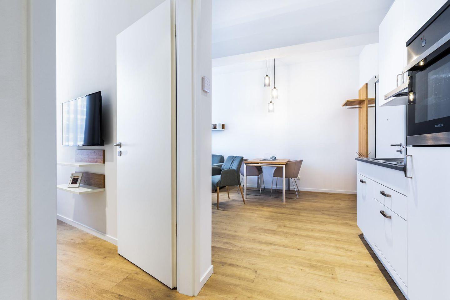 Das helle und moderne Nichtraucher-Apartment verfügt über Fußbodenheizung, kostenfreies WLAN und eine voll ausgestattete offene Küche mit Geschirrspüler, Kühlschrank, einen Herd mit 2 Glaskeramikkochfeldern und Backofen, Kaffeemaschine, Toaster, Wasserkocher und Mixstab. Im separaten Schlafzimmer befindet sich ein komfortables Boxspring-Doppelbett (1,80 x 2,00 m) und ein Flatscreen-TV (40 Zoll). Im kombinierten Wohn-Essbereich stehen euch ein Flatscreen-TV (40 Zoll) und eine Musikanlage sowie eine Einzelschlafcouch (1,20 x 1,95 m) zur Verfügung. Das Apartment verfügt über einen Safe für Laptopgröße bis ca. 17 Zoll. Im modernen Badezimmer befinden sich eine ebenerdige Regendusche, ein Waschtisch, WC, ein Handtuchwärmer sowie ein Föhn.