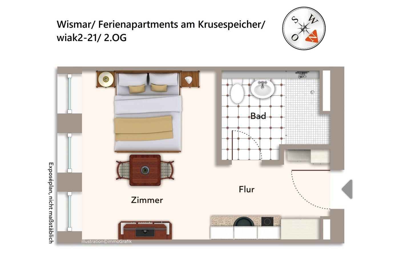 Das hochwertige Apartment befindet sich in südöstlicher Lage im zweiten Obergeschoss des Gebäudes. Der Alte Hafen von Wismar, einer der attraktivsten Orte der Hansestadt, liegt euch hier zu Füßen. Von hier aus lässt sich die Stadt und das schöne Umland ideal erkunden. Der Alte Hafen ist übrigens auch ein sehr beliebter Veranstaltungsort für Events und Feste.