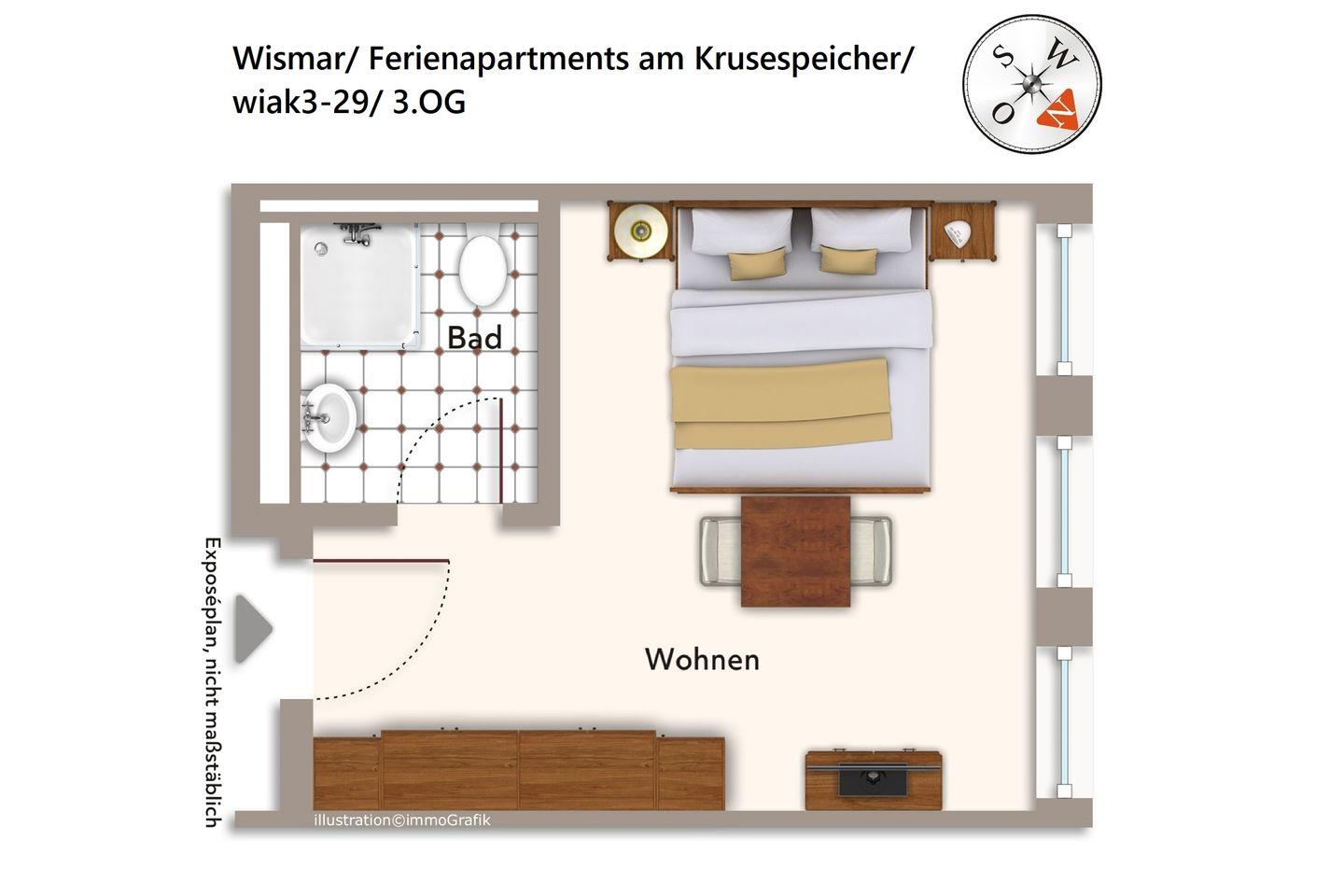 Modernes 1-Zimmer-Apartment mit Hafenblick im maritimen Wismar, inklusive Sauna und kostenfreiem WLAN.
