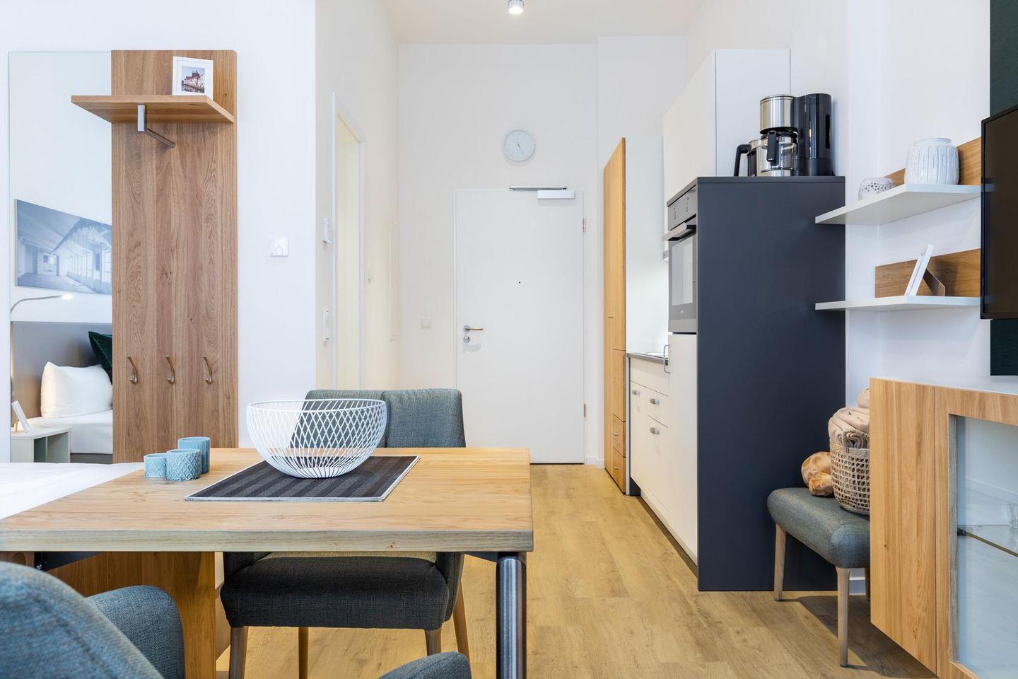 Das helle und moderne Nichtraucher-Apartment verfügt über Fußbodenheizung, kostenfreies WLAN und eine voll ausgestattete offene Küche mit Geschirrspüler, Kühlschrank, einen Herd mit 2 Glaskeramikkochfeldern und Backofen, Kaffeemaschine, Toaster, Wasserkocher und Mixstab. Im kombinierten Wohn-Schlafbereich befinden sich ein komfortables Boxspring-Doppelbett (1,80 x 2,00 m), ein Flatscreen-TV (40 Zoll) und eine Musikanlage. Das Apartment verfügt über einen Safe für Laptopgröße bis ca. 17 Zoll. Im modernen Badezimmer stehen euch eine ebenerdige Regendusche, ein Waschtisch, WC, ein Handtuchwärmer sowie ein Föhn zur Verfügung.