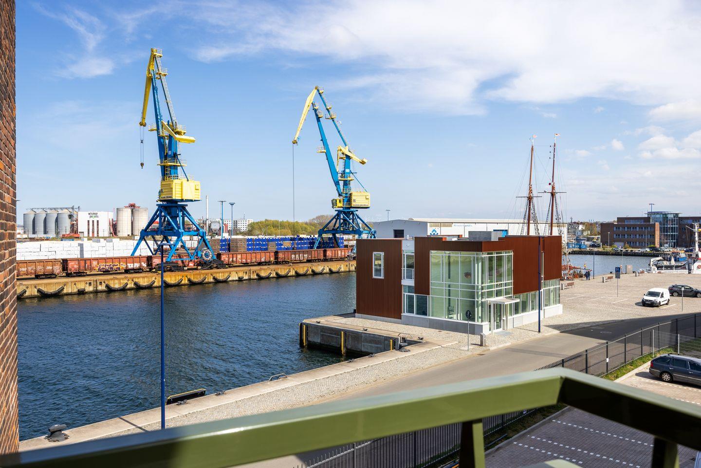Modernes Hafenapartment mit Balkon und Saunalandschaft in Wismar, ideal für entspannte Auszeit am Alten Hafen.