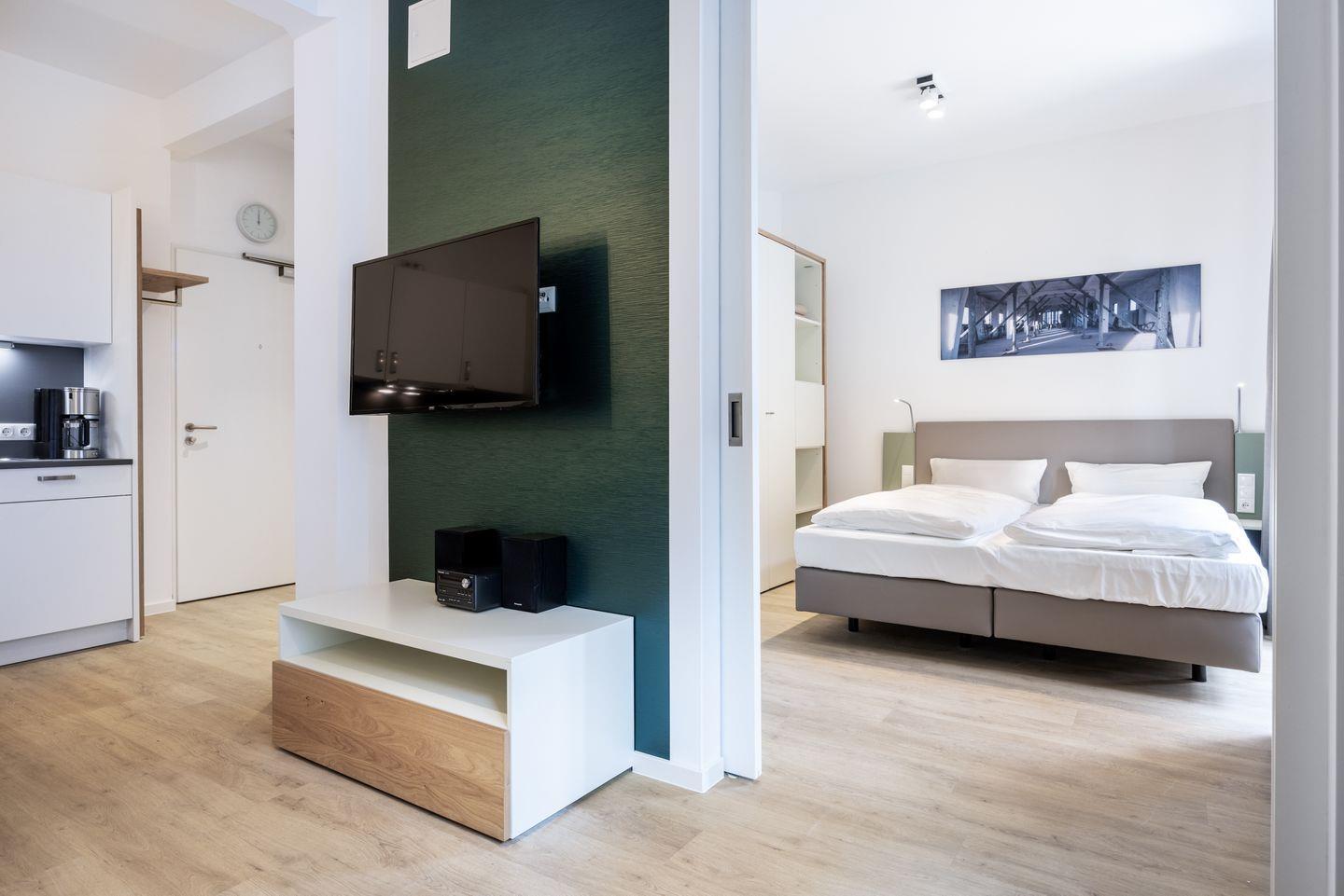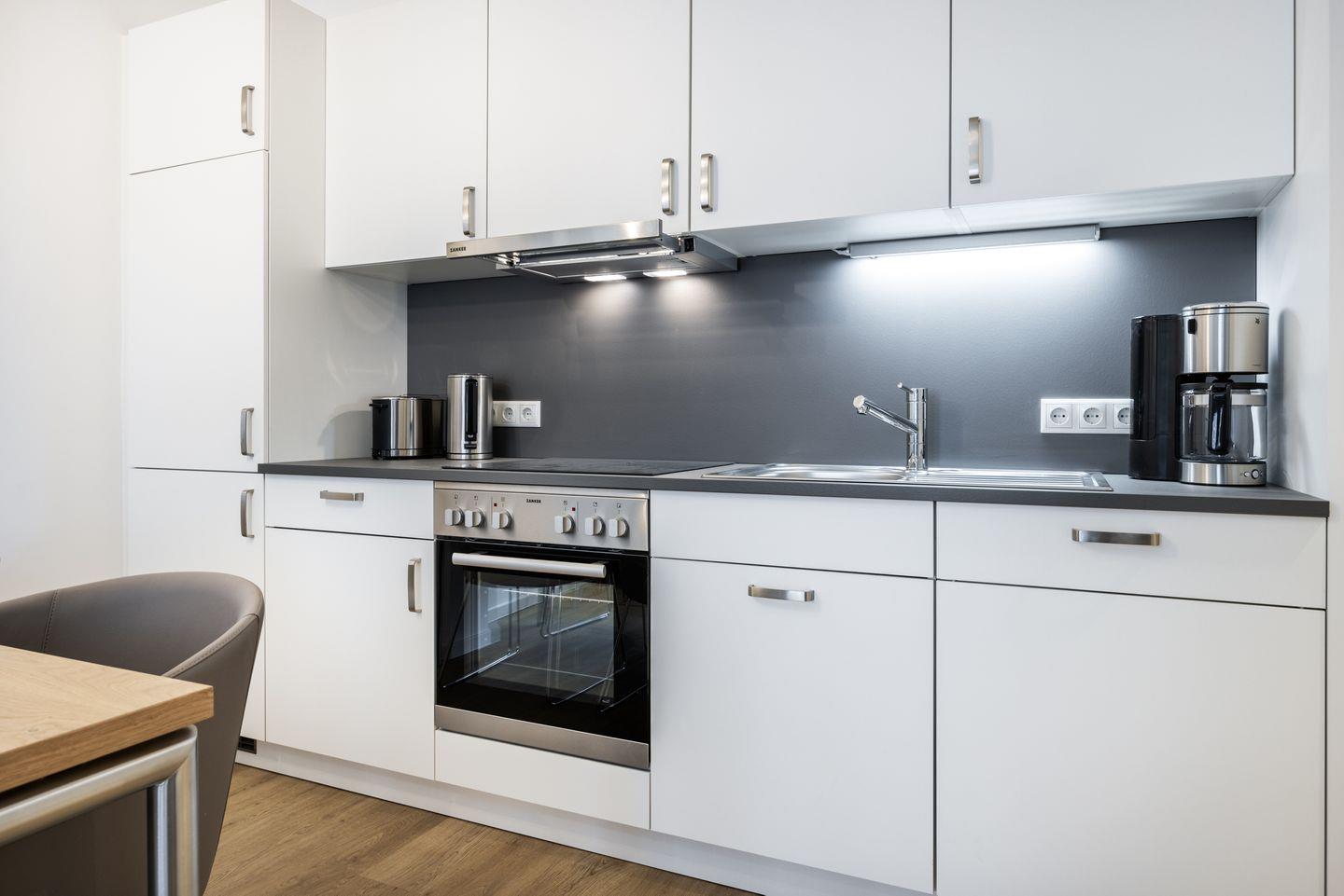 Das helle Apartment verfügt über bodentiefe Fenster, Fußbodenheizung, kostenfreies WLAN und eine voll ausgestattete offene Küche mit Geschirrspüler, Kühlschrank mit Tiefkühlfach, Herd mit 4 Glaskeramikkochfeldern und Backofen, Kaffeemaschine, Toaster, Wasserkocher und Mixstab. Im kombinierten Wohn-Essbereich befinden sich eine Einzelschlafcouch (1,20 x 2,00 m), ein Flatscreen-TV (42 Zoll), eine HiFi-Anlage sowie Gesellschaftsspiele. Genießt schöne Stunden auf dem Balkon mit Blick zum Hafen. Das Schlafzimmer beinhaltet ein komfortables Boxspring-Doppelbett (1,80 x 2,00 m) und einen Flatscreen-TV (42 Zoll). Im geschmackvollen Badezimmer stehen euch eine ebenerdige Regendusche, ein Waschtisch, WC, ein Handtuchwärmer sowie ein Föhn zur Verfügung. Das Apartment verfügt über einen Safe für eine Laptopgröße bis ca. 17 Zoll.