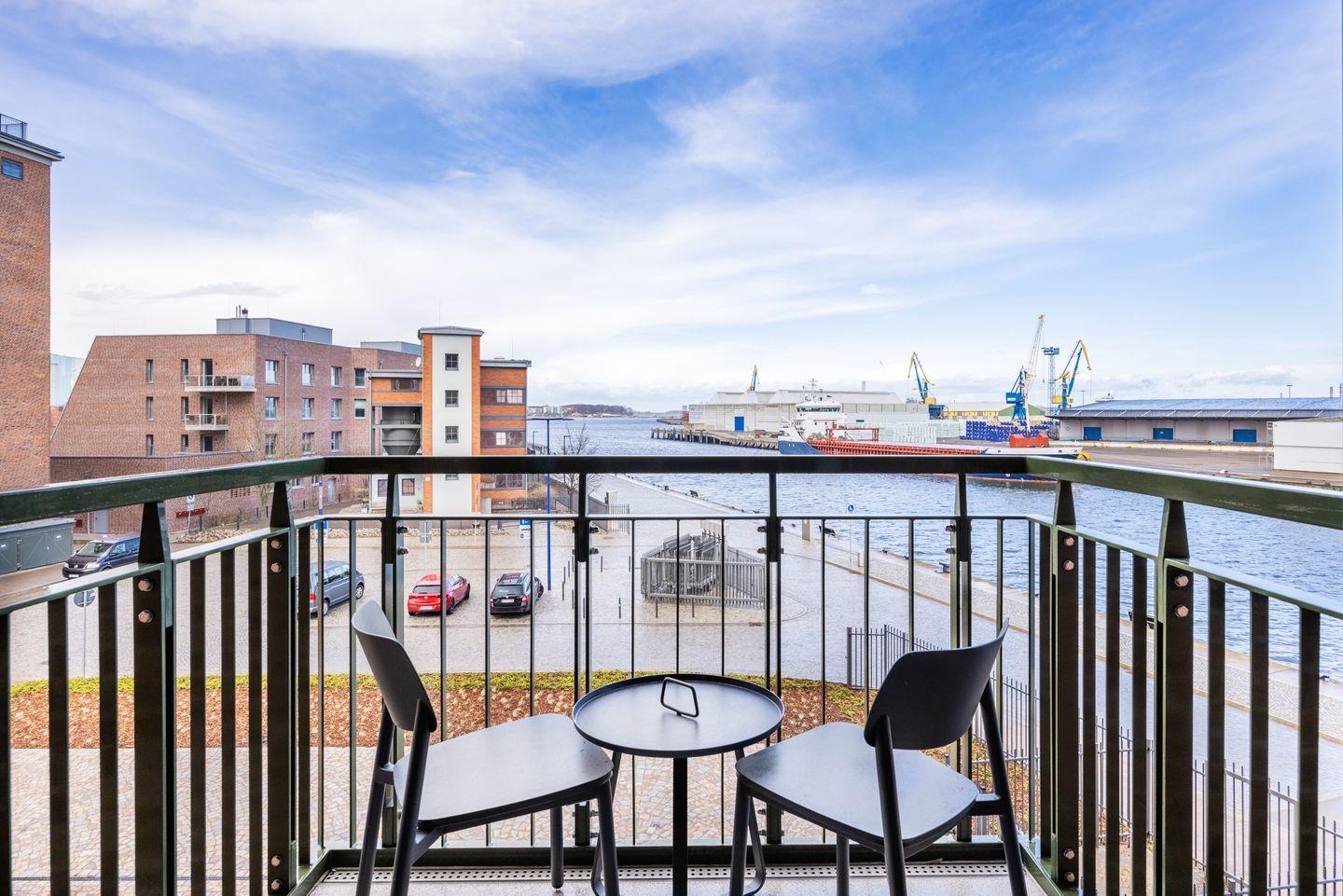 Modernes Apartment in Wismar mit Balkon und Blick auf den Alten Hafen.
