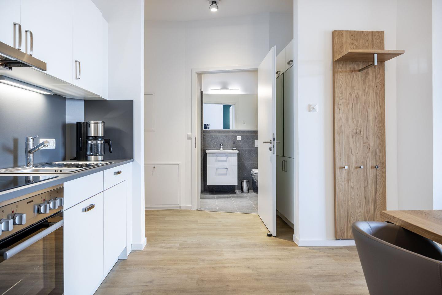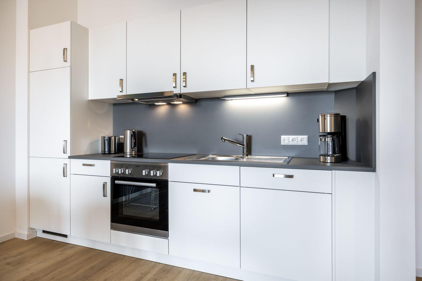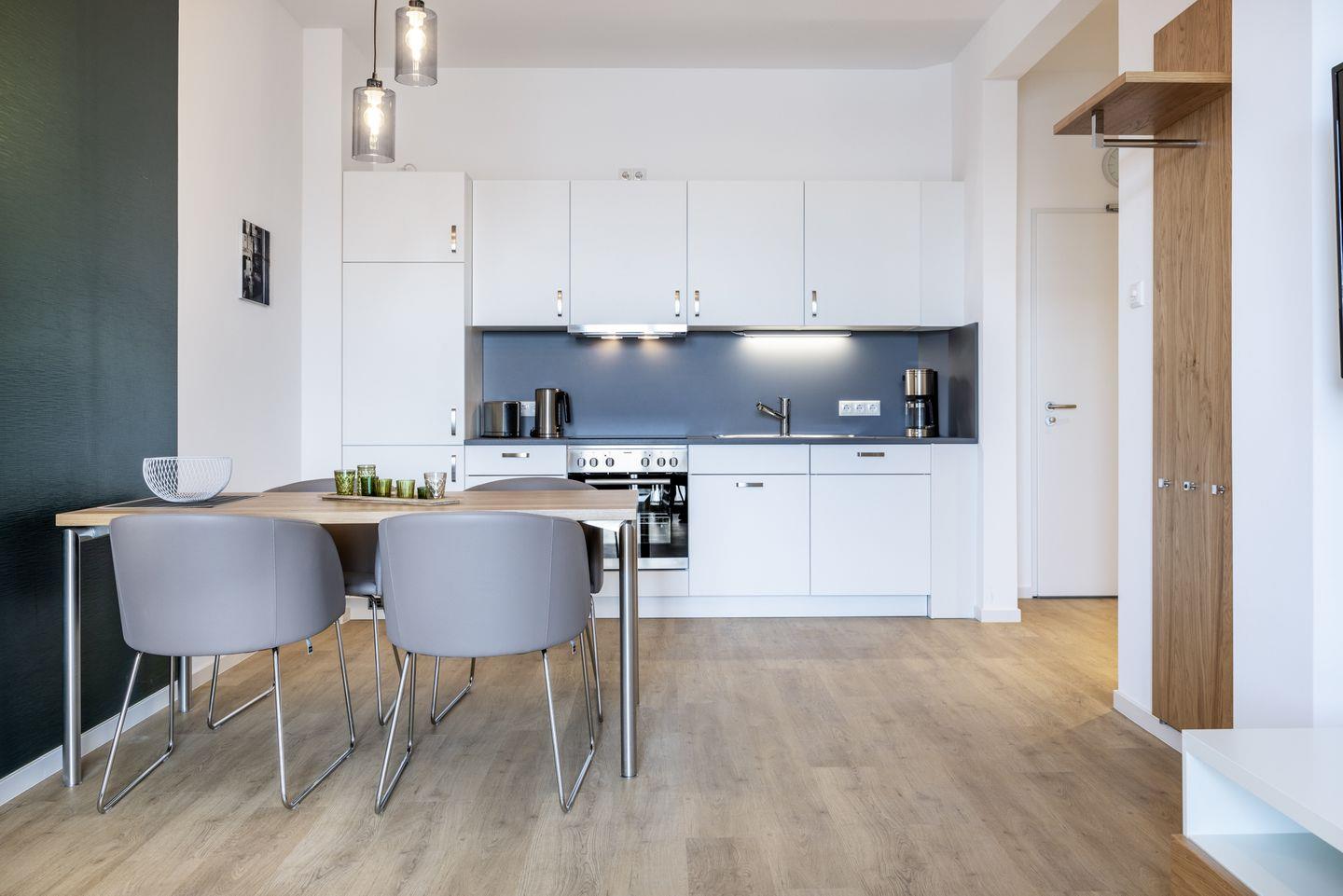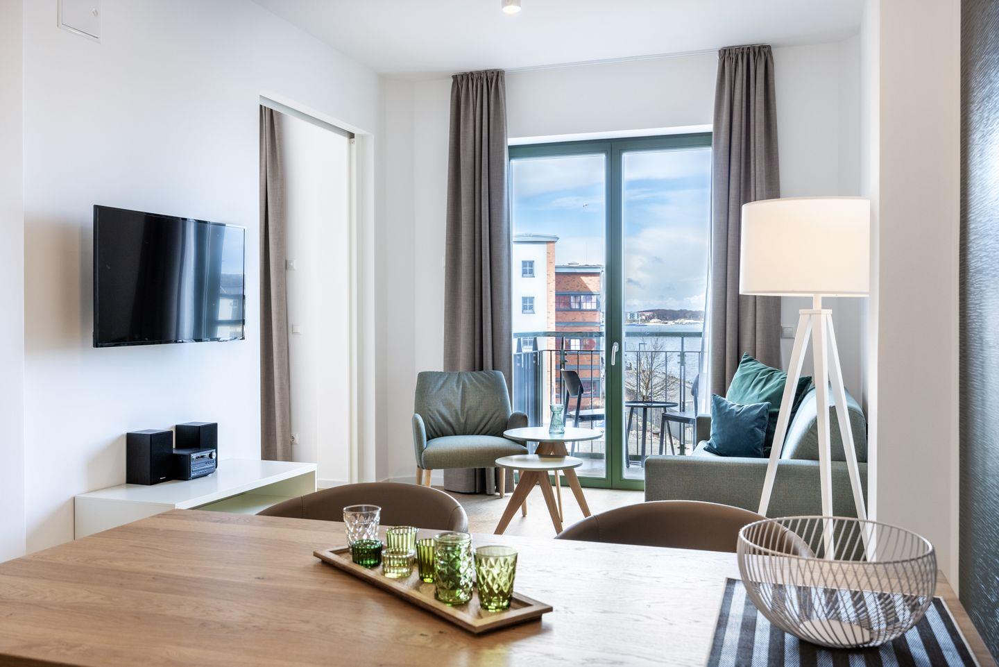 Das helle Apartment verfügt über bodentiefe Fenster, Fußbodenheizung, kostenfreies WLAN und eine voll ausgestattete offene Küche mit Geschirrspüler, Kühlschrank mit Tiefkühlfach, Herd mit 4 Glaskeramikkochfeldern und Backofen, Kaffeemaschine, Toaster, Wasserkocher und Mixstab. Im kombinierten Wohn-Essbereich befinden sich eine Doppelschlafcouch (1,40 x 2,00 m), ein Flatscreen-TV (42 Zoll), eine HiFi-Anlage sowie Gesellschaftsspiele. Genießt schöne Stunden auf dem Balkon mit direktem Blick zum Hafen. Das Schlafzimmer beinhaltet ein komfortables Boxspring-Doppelbett (1,80 x 2,00 m) und einen Flatscreen-TV (42 Zoll). Im geschmackvollen Badezimmer stehen euch eine ebenerdige Regendusche, ein Waschtisch, WC, ein Handtuchwärmer sowie ein Föhn zur Verfügung. Das Apartment verfügt über einen Safe für eine Laptopgröße bis ca. 17 Zoll.