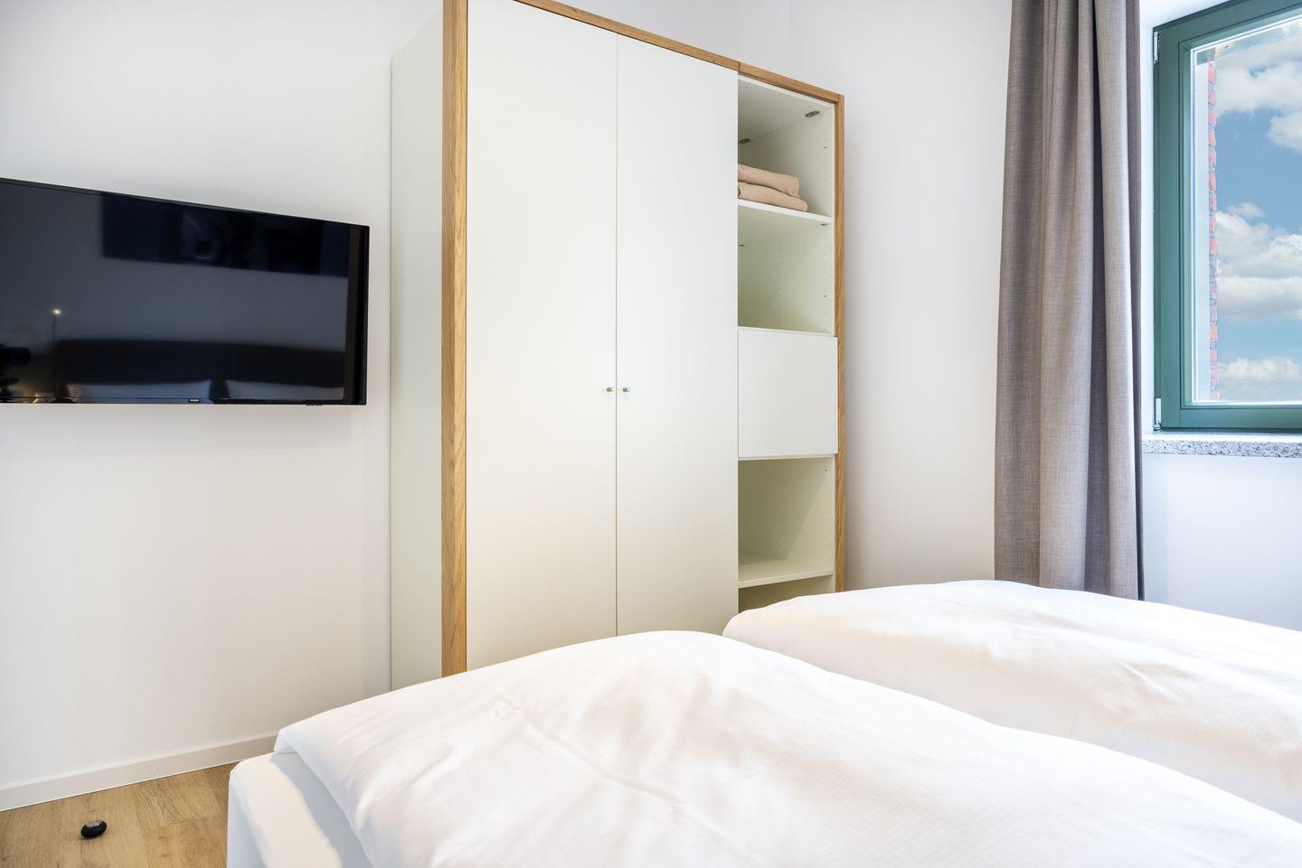 Das helle Apartment verfügt über bodentiefe Fenster, Fußbodenheizung, kostenfreies WLAN und eine voll ausgestattete offene Küche mit Geschirrspüler, Kühlschrank mit Tiefkühlfach, Herd mit 4 Glaskeramikkochfeldern und Backofen, Kaffeemaschine, Toaster, Wasserkocher und Mixstab. Im kombinierten Wohn-Essbereich befinden sich eine Doppelschlafcouch (1,40 x 2,00 m), ein Flatscreen-TV (42 Zoll), eine HiFi-Anlage sowie Gesellschaftsspiele. Das Schlafzimmer beinhaltet ein komfortables Boxspring-Doppelbett (1,80 x 2,00 m) und einen Flatscreen-TV (42 Zoll). Im geschmackvollen Badezimmer stehen euch eine ebenerdige Regendusche, ein Waschtisch, WC, ein Handtuchwärmer sowie ein Föhn zur Verfügung. Das Apartment verfügt über einen Safe für eine Laptopgröße bis ca. 17 Zoll.