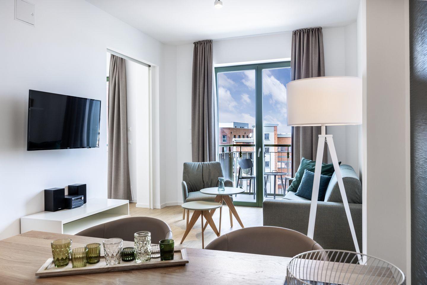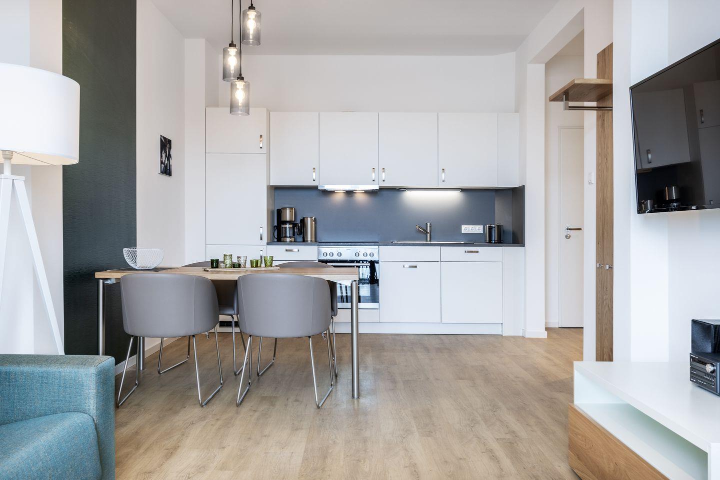 Das helle Apartment verfügt über bodentiefe Fenster, Fußbodenheizung, kostenfreies WLAN und eine voll ausgestattete offene Küche mit Geschirrspüler, Kühlschrank mit Tiefkühlfach, Herd mit 4 Glaskeramikkochfeldern und Backofen, Kaffeemaschine, Toaster, Wasserkocher und Mixstab. Im kombinierten Wohn-Essbereich befinden sich eine Doppelschlafcouch (1,40 x 2,00 m), ein Flatscreen-TV (42 Zoll), eine HiFi-Anlage sowie Gesellschaftsspiele. Genießt schöne Stunden auf dem Balkon mit direktem Blick zum Hafen. Das Schlafzimmer beinhaltet ein komfortables Boxspring-Doppelbett (1,80 x 2,00 m) und einen Flatscreen-TV (42 Zoll). Im geschmackvollen Badezimmer stehen euch eine ebenerdige Regendusche, ein Waschtisch, WC, ein Handtuchwärmer sowie ein Föhn zur Verfügung. Das Apartment verfügt über einen Safe für eine Laptopgröße bis ca. 17 Zoll. Ein Kinderbett kann gegen Entgelt im Schlafzimmer aufgestellt werden. Hunde sind in diesem Apartment gestattet.