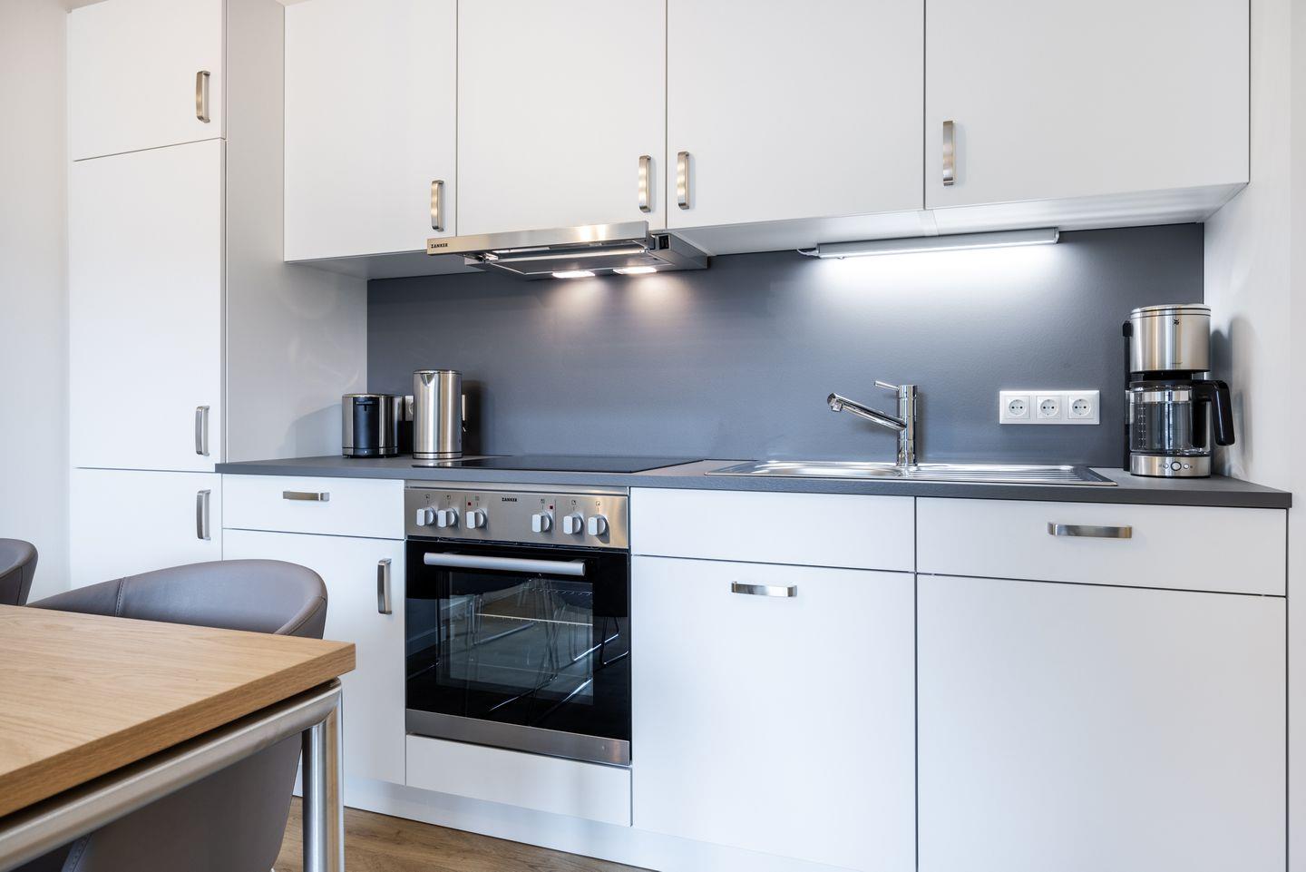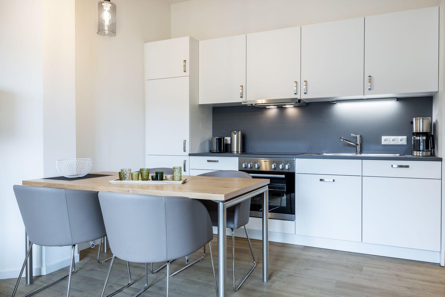 Das helle Apartment verfügt über bodentiefe Fenster, Fußbodenheizung, kostenfreies WLAN und eine voll ausgestattete offene Küche mit Geschirrspüler, Kühlschrank mit Tiefkühlfach, Herd mit 4 Glaskeramikkochfeldern und Backofen, Kaffeemaschine, Toaster, Wasserkocher und Mixstab. Im kombinierten Wohn-Essbereich befinden sich eine Einzelschlafcouch (1,20 x 2,00 m), ein Flatscreen-TV (42 Zoll), eine HiFi-Anlage sowie Gesellschaftsspiele. Genießt schöne Stunden auf dem Balkon mit Blick zum Hafen.