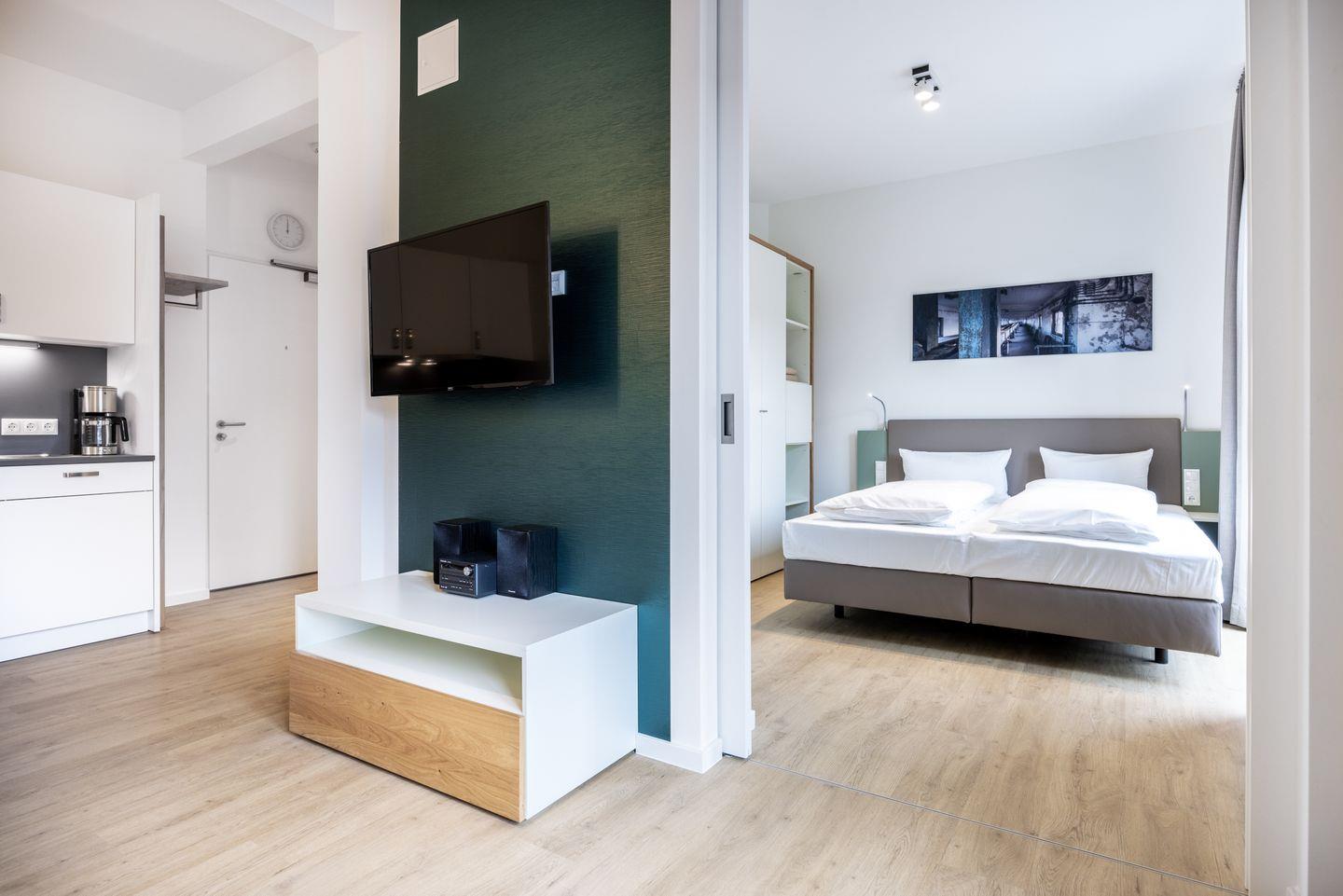 Das Schlafzimmer beinhaltet ein komfortables Boxspring-Doppelbett (1,80 x 2,00 m) und einen Flatscreen-TV (42 Zoll). Im geschmackvollen Badezimmer stehen euch eine ebenerdige Regendusche, ein Waschtisch, WC, ein Handtuchwärmer sowie ein Föhn zur Verfügung. Das Apartment verfügt über einen Safe für eine Laptopgröße bis ca. 17 Zoll.